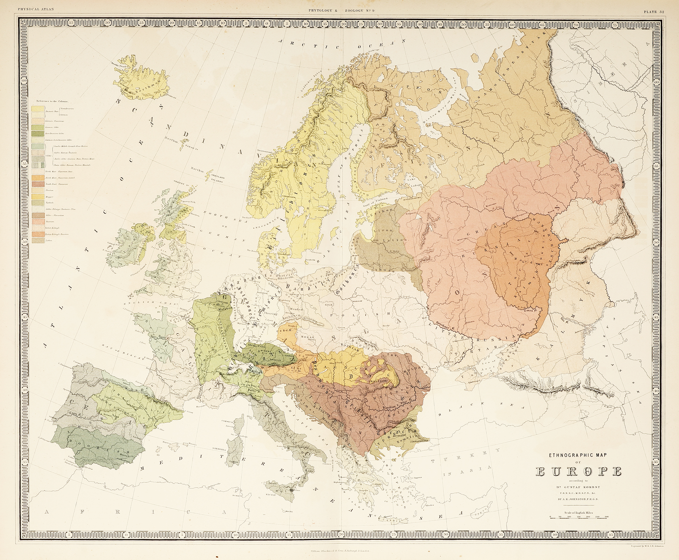 Spectacular ethnography map of Eurpoe, from the extra large sized issue of Johnston’s, Physical Atlas of Natural Phenomena.