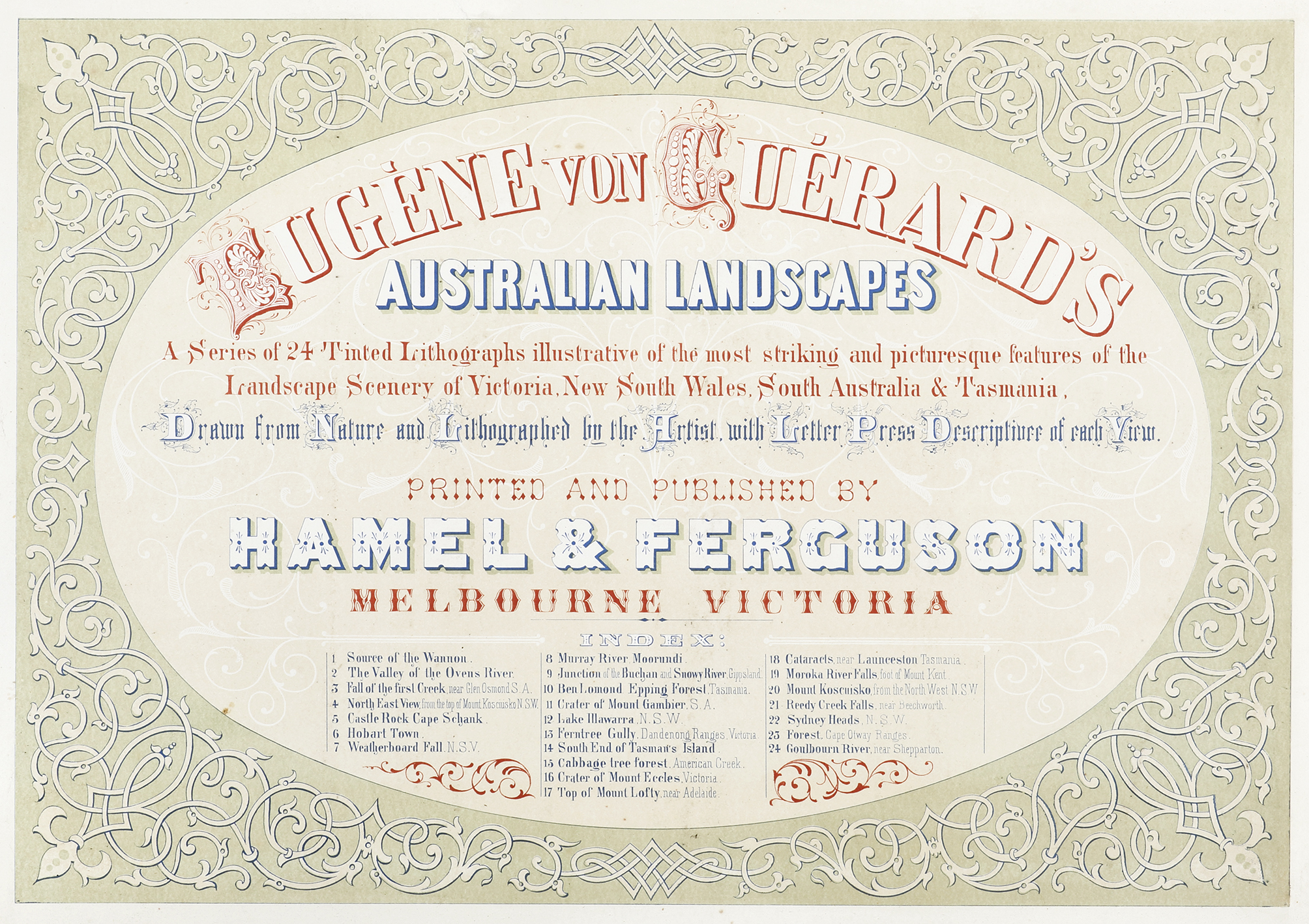 Scarce title page from Eugene von Guerard’s famous series of large colonial views of Australia printed and published by Hamel & Ferguson Melbourne, Victoria.