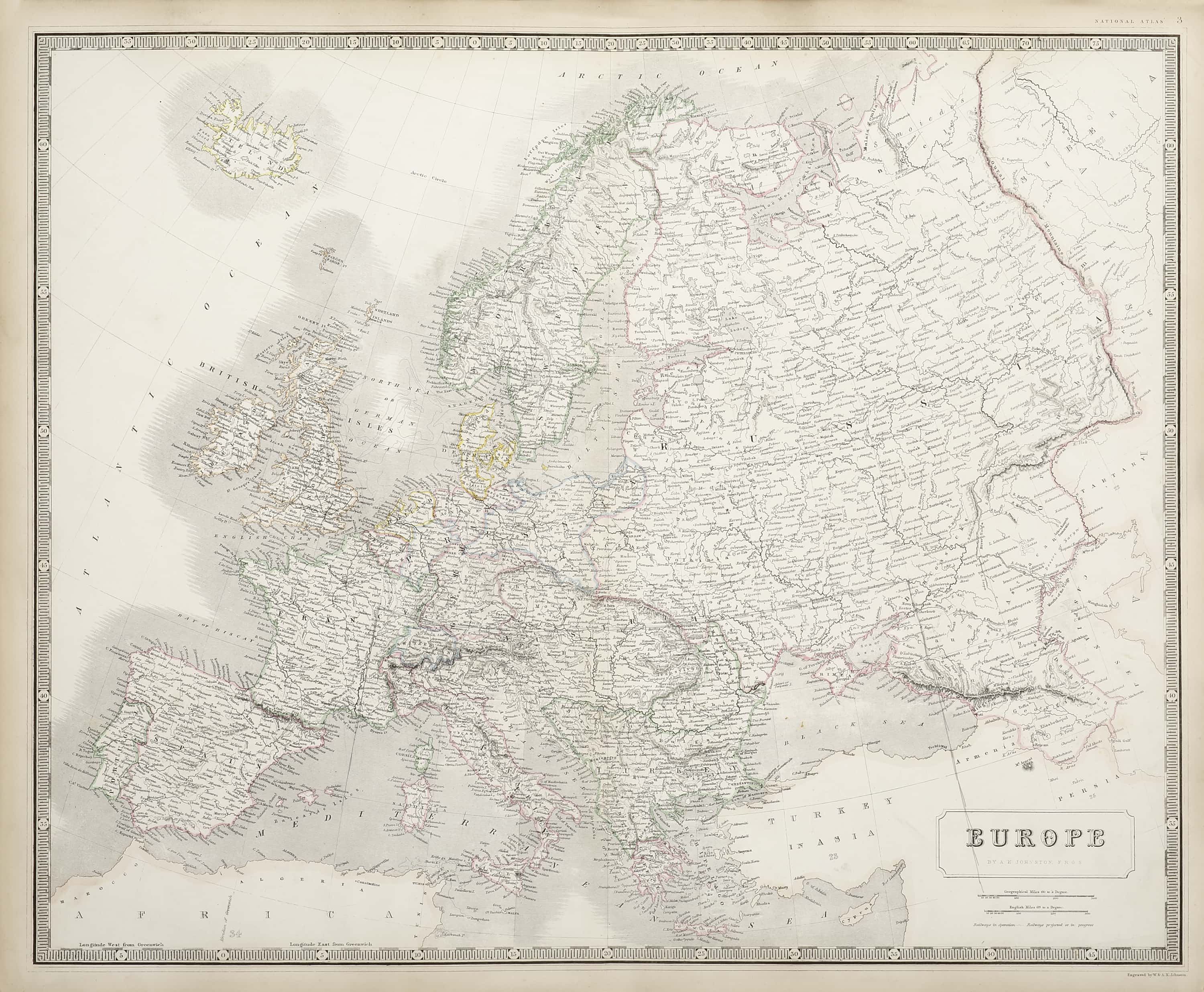 First edition of this large scale c.19th map of Europe by Alexander Keith Johnston (1804–1871) the Geographer Royal for Great Britain.
