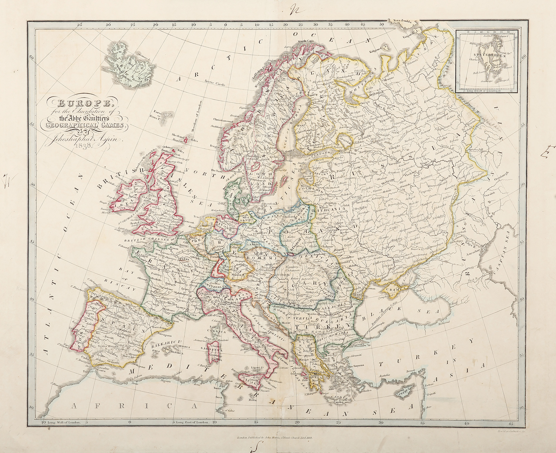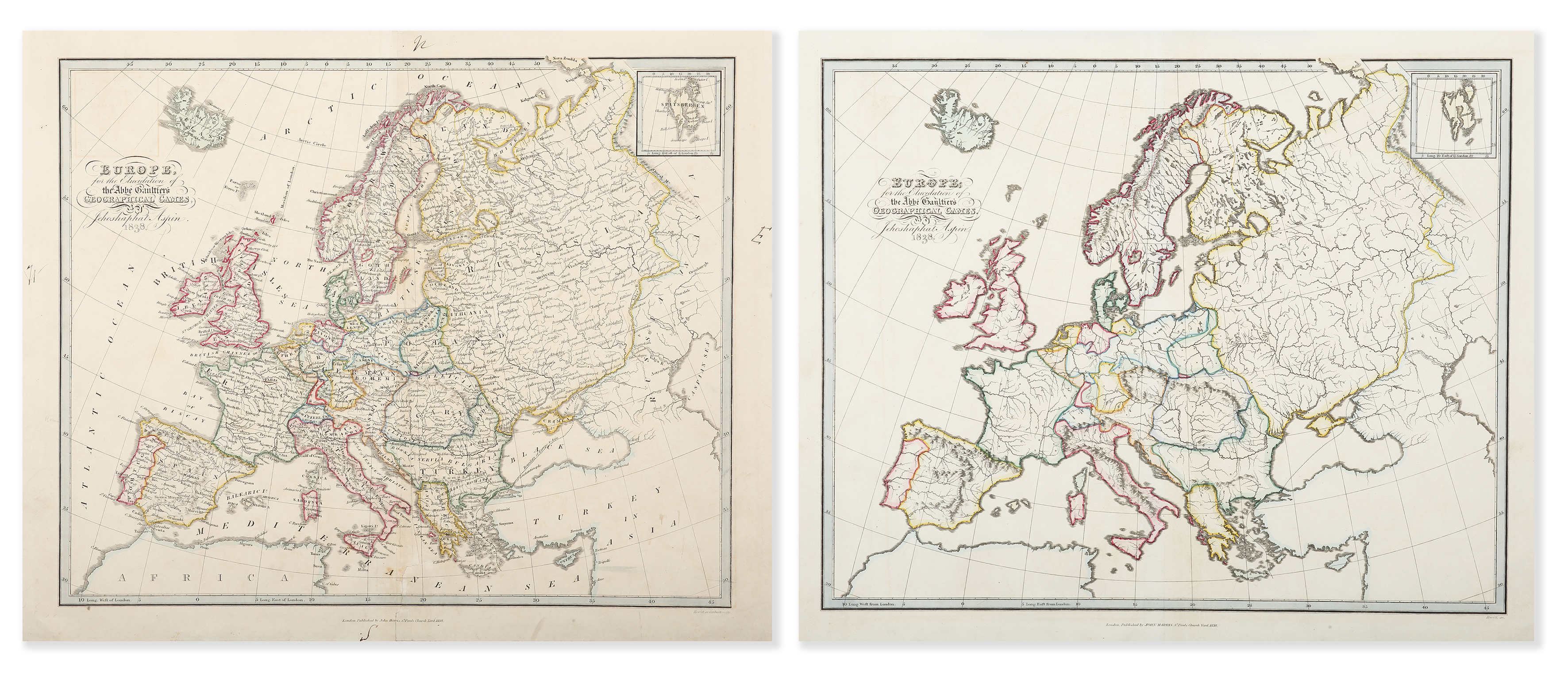 Scarce pair of c.19th educational maps of Europe, from, A complete course of geography, by means of instructive games, invented by the Abbe Gaultier, by Jehoshaphat Aspin.
