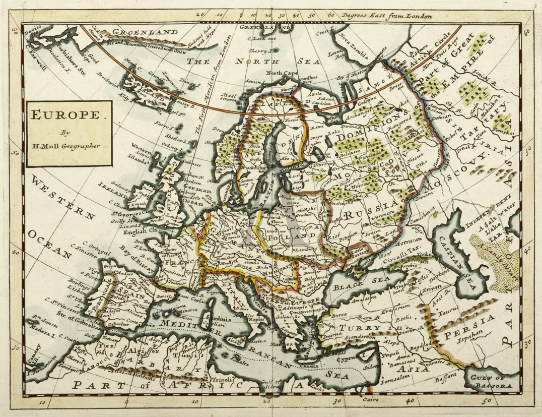 Moll was a Dutch emigre who came to London about 1680 following the Scanian Wars, he first worked as an engraver for Moses Pitt, later setting up his own business and becoming, after the turn of the century, the foremost map publisher in England. As his fame grew he became a well known figure at in the group of Intelligencia who gathered at Jonathon's Coffee House in Exchange Alley or Change Alley. This narrow alleyway connecting shops and coffeehouses in an old neighbourhood of the City of London, served as a convenient shortcut from the Royal Exchange on Cornhill to the Post Office on Lombard Street. Shops once located in Exchange Alley included ship chandlers, makers of navigation instruments such as telescopes, and goldsmiths from Lombardy in Italy. The coffee houses of Exchange Alley, especially Jonathan's and Garraway's, became an early venue for the lively trading of shares and commodities. Moll was able to obtain crucial information from the lively commercial and intellectual scene in the area. Moll was at the forefront of map making during his working life and his maps reflect his ever inquisitive nature.