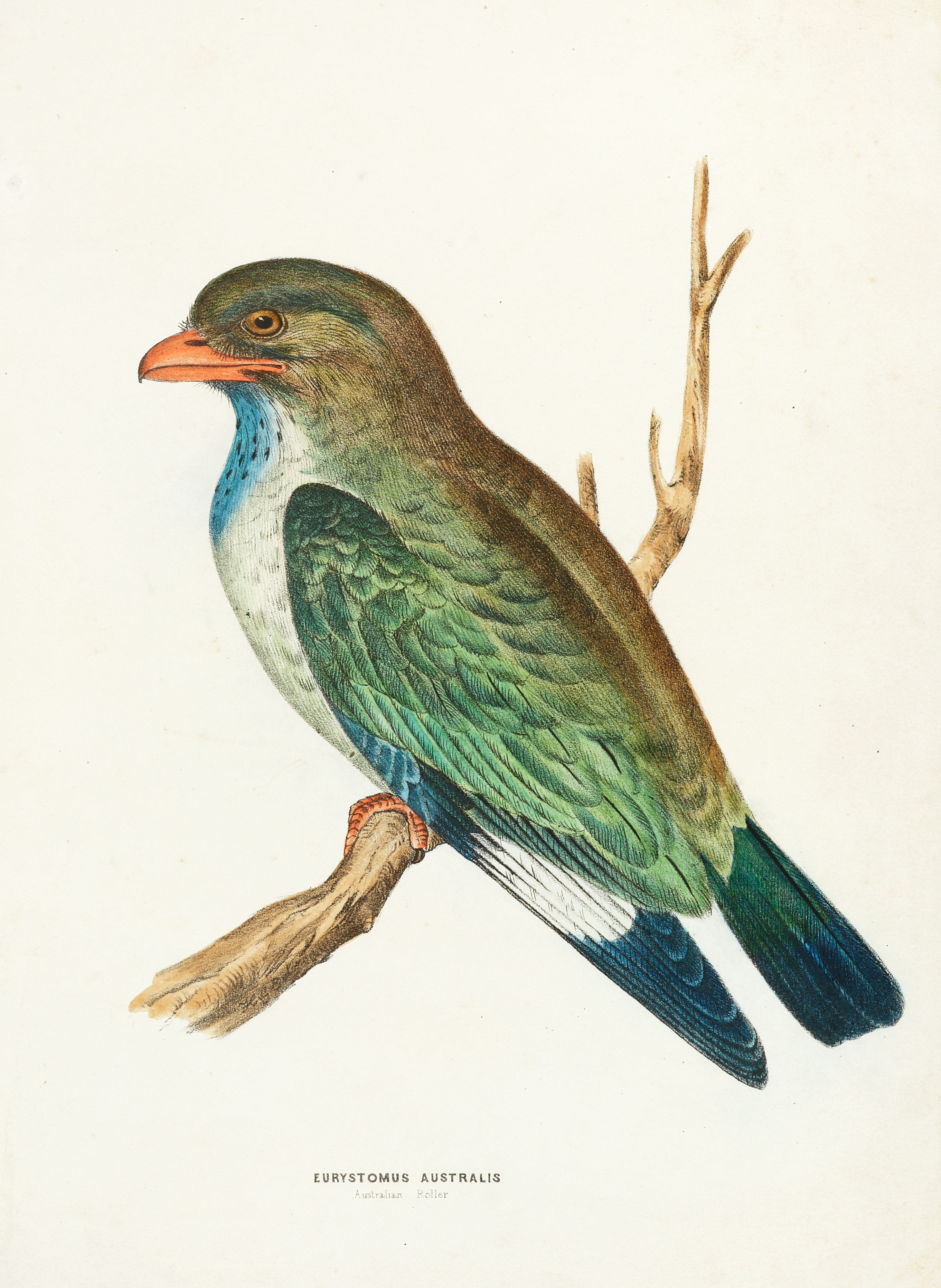 Very rare lithograph of the Australian roller from Silvester Diggles, The Ornithology of Australia. This work is one of the great rarities of Australian ornithology. A rare and important work.