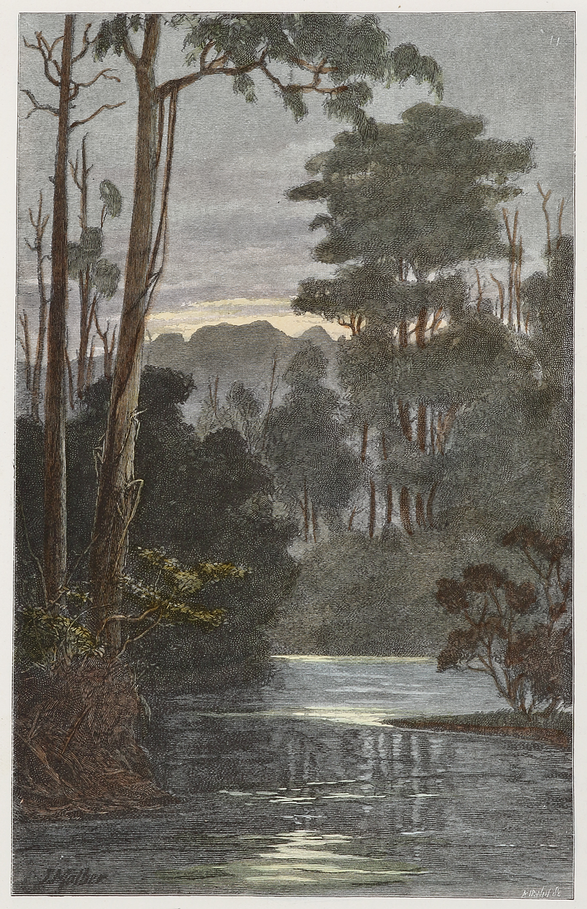 Scarce c.19th hand coloured engraving of an evening scene on the Yarra.