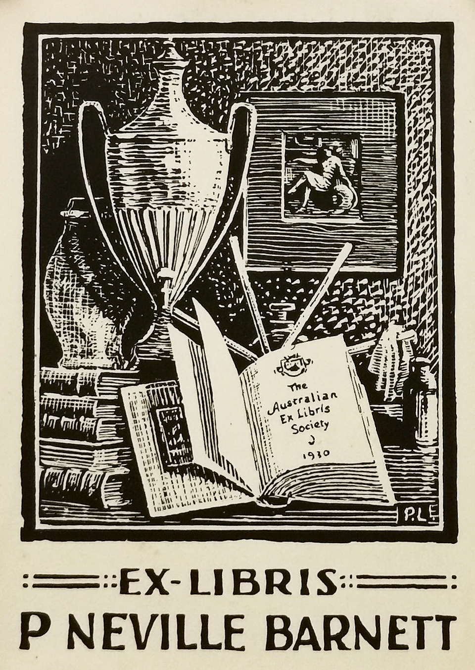 Phillip Litchfield book plate for Philip Neville Barnett. Provenance: From the personal collection of the Sydney artist, Ella Dwyer who was a foundation member of the Australian Bookplate Club in 1932.