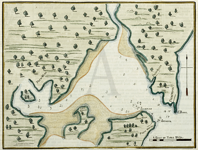 An engraving issued in the original edition of the Illustrated Sydney News of James Cook map he made of Botany Bay on his first voyage in 1769-70.