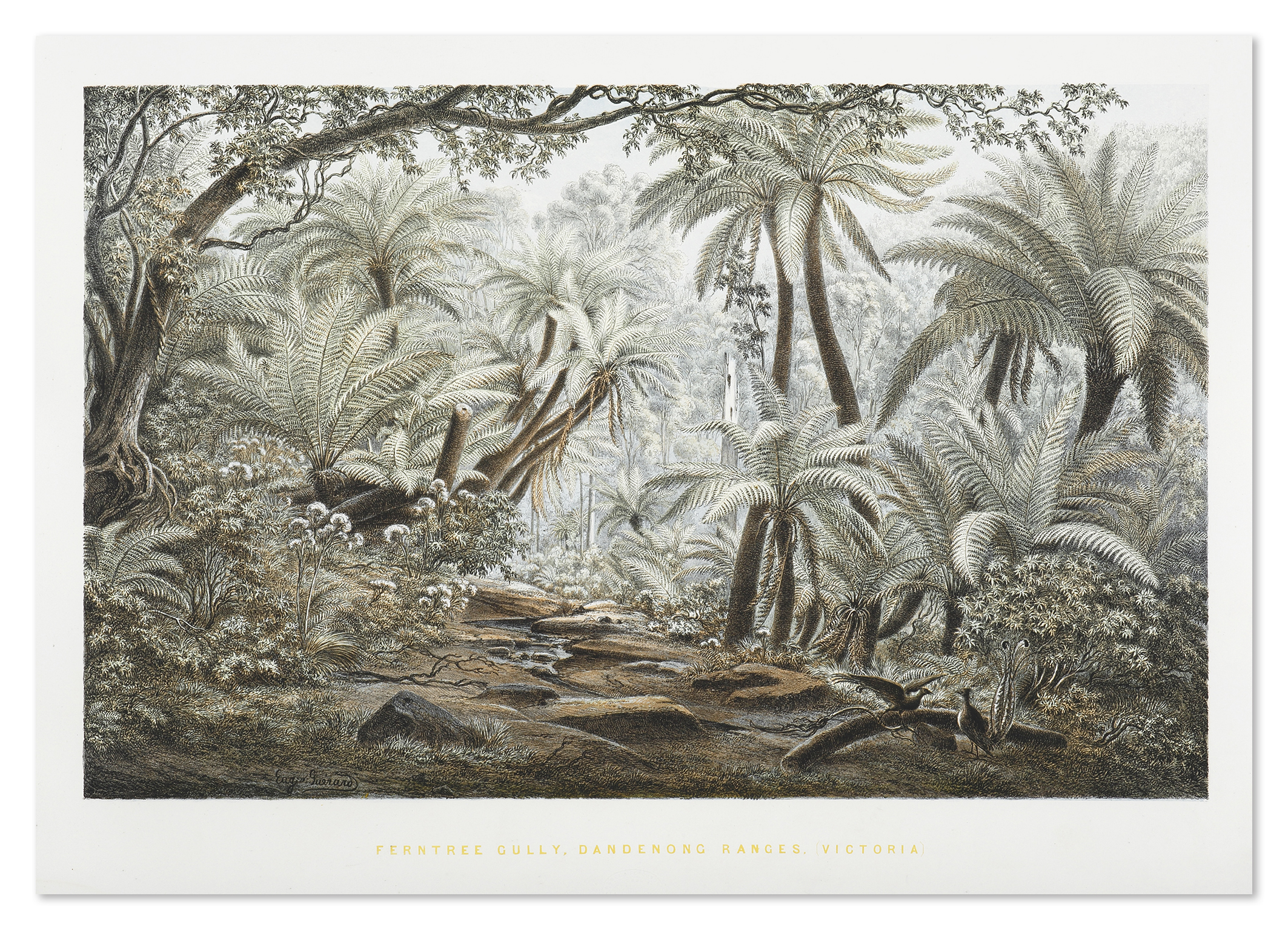 Painted on return to the artist’s Melbourne studio, Ferntree Gully in the Dandenong Ranges is a work that combines von Guérard’s meticulous observation of local plant species with his artistic interest in compositional arrangement and the creation of a ‘mood’ particular to this environment. In this case we are privy to the magical world of a bower – an enclosed gully of natural foliage created by towering tree ferns. A pool of light on the forest floor leads us to two male lyrebirds cast in shadow, one with its characteristic tail feathers raised – a natural mimic of the arch of the fern fronds. The theatrical activities of the lyrebird were one of the early drawcards for tourists to the area, who hoped to witness the singing and dancing of the male bird. Tim Bonyhady, Australian colonial paintings in the Australian National Gallery, Canberra: Australian National Gallery, 1986, p. 171. for the oil for this lithograph which was originally bought by F.G. Dalgety, founder of Dalgety & Co.