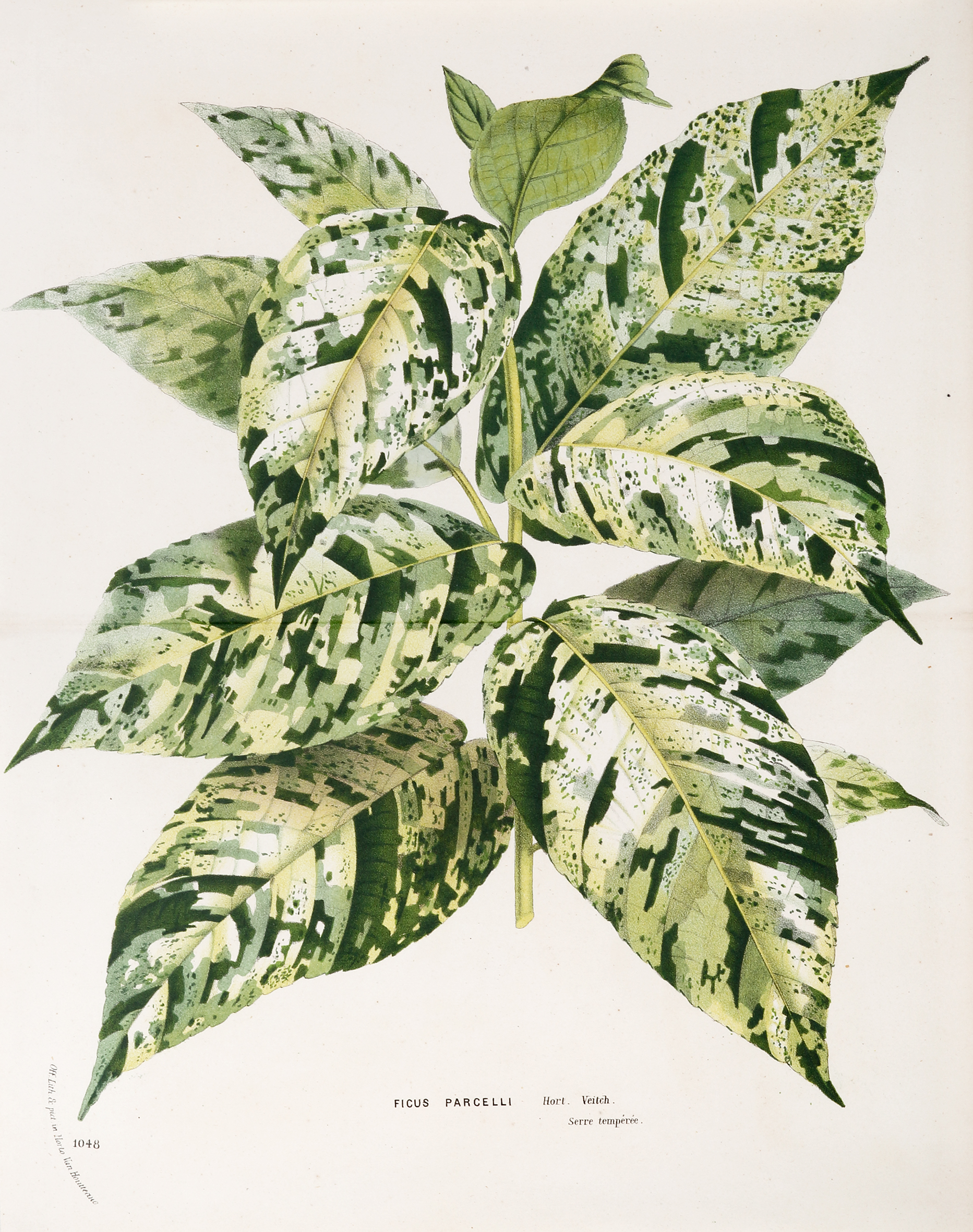 Note this lithograph double the standard size. Stunning exotic botanical from Louis van Houtte’s, Flore des Serres et des Jardins de l’Europe (Flowers of the Greenhouses and Gardens of Europe). Common name: Florida Strangler Fig or Mosaic Clown FigBinomial name: Ficus … Read Full Description