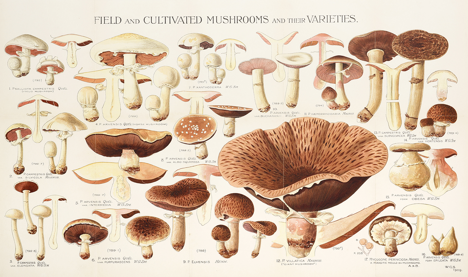 Field and Cultivated Mushrooms and their Varieties. - Antique Print from 1909