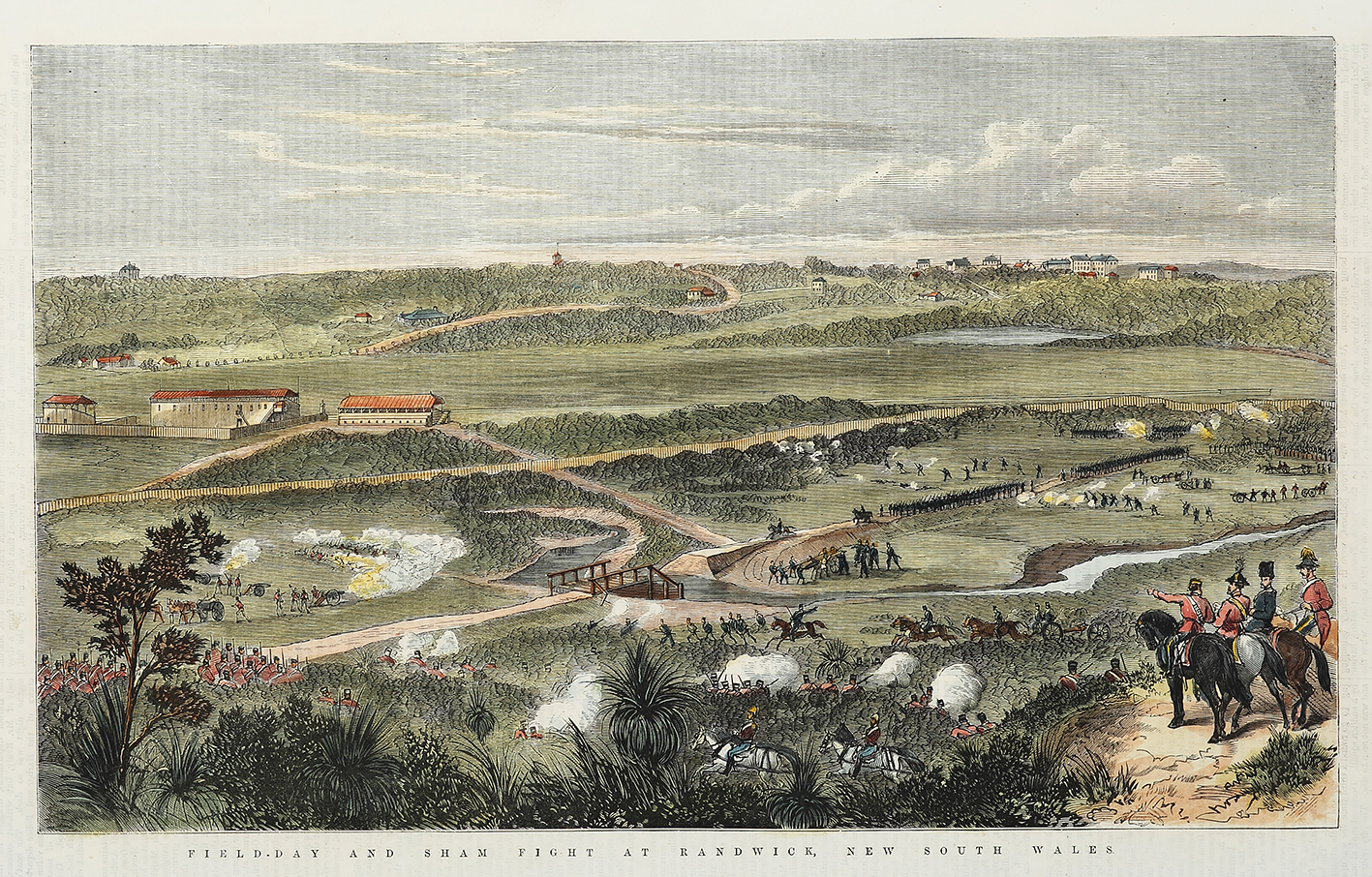 Rare, c.19th large hand coloured engraving of military exercises at Randwick.