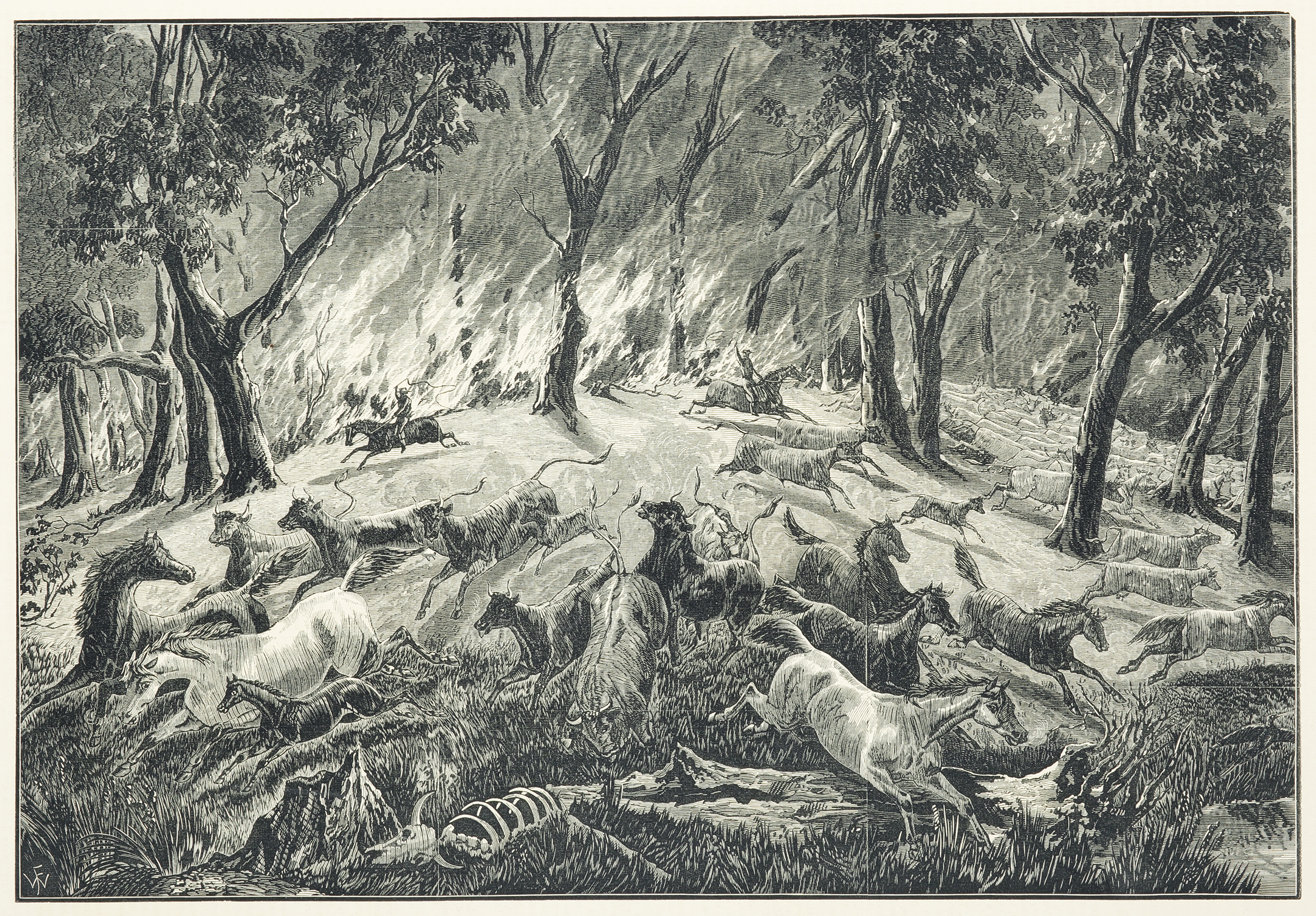 Scene of livestock fleeing a bush fire. From the original edition of the Australasian Sketcher.