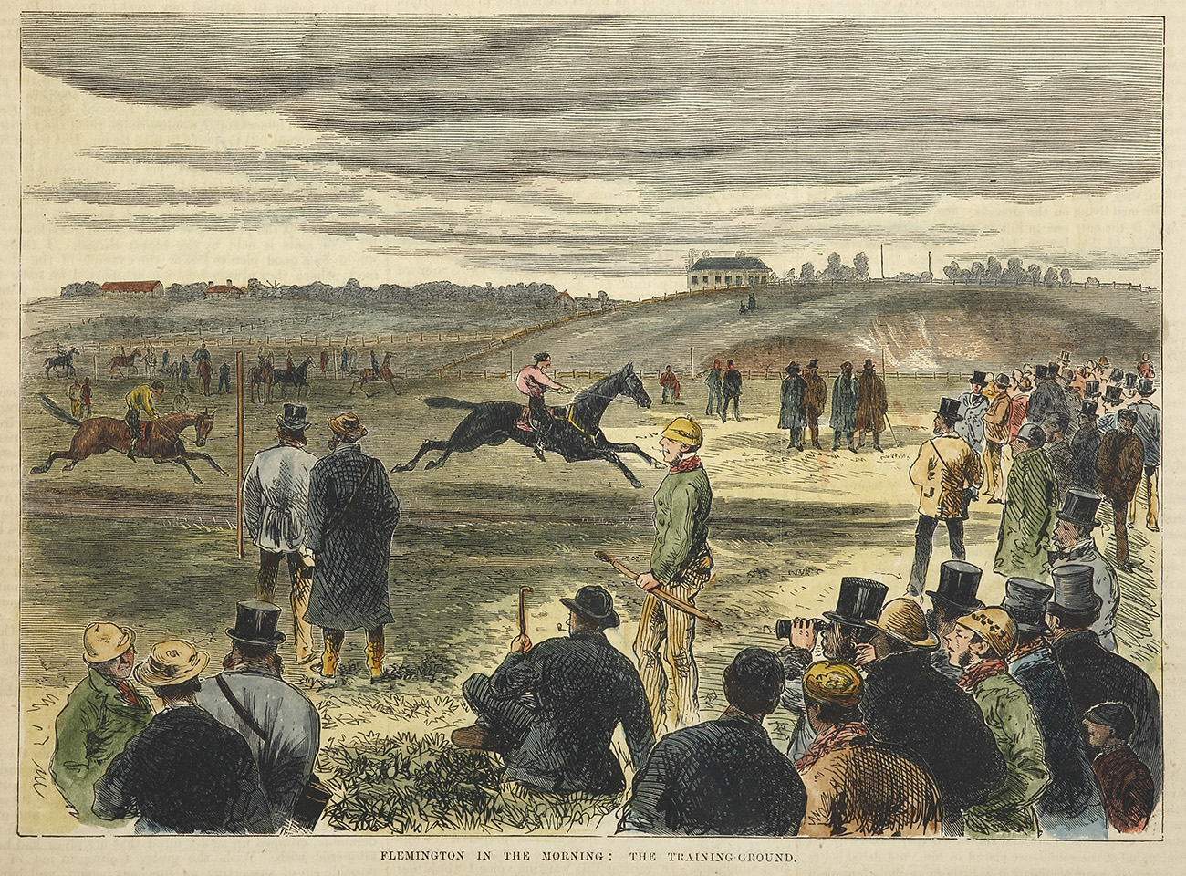 Scarce colonial engraving of horses working out at Flemington racecourse. From the original edition of the Australasian Sketcher. Collections: National Library Australia: Bib ID 914558 State Library New South Wales: REF1/MAV/FM4/9236-9239 State Library Victoria: PCINF AS 06-09-73 P.104