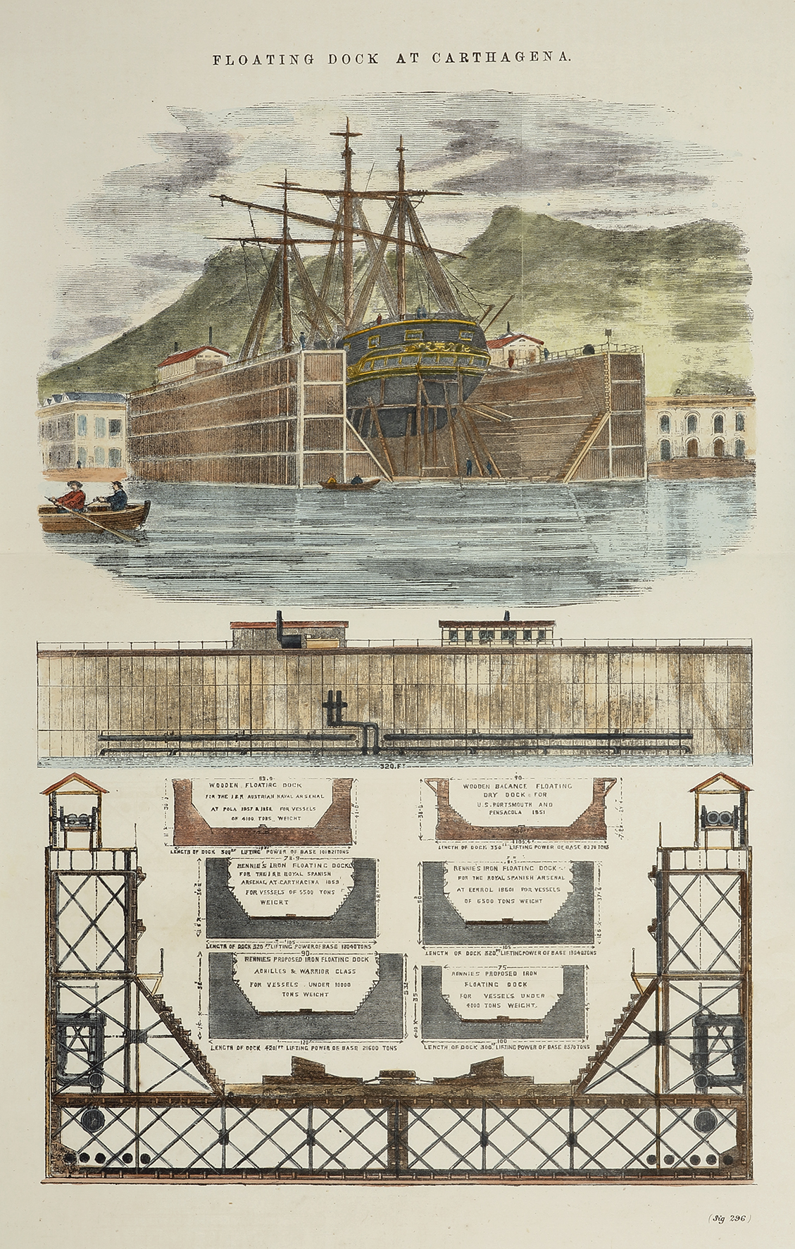Rare lithograph of the floating dock at Cartagena, Spain. Cartagena was one of the most important ports in the western Mediterranean. In 1728, Cartagena had become the capital of the Spanish Navy’s Maritime Department of the Mediterranean and the city was heavily fortified with the construction of a modern castle in the place of a former Moorish Kasbah, several barracks and a huge arsenal.