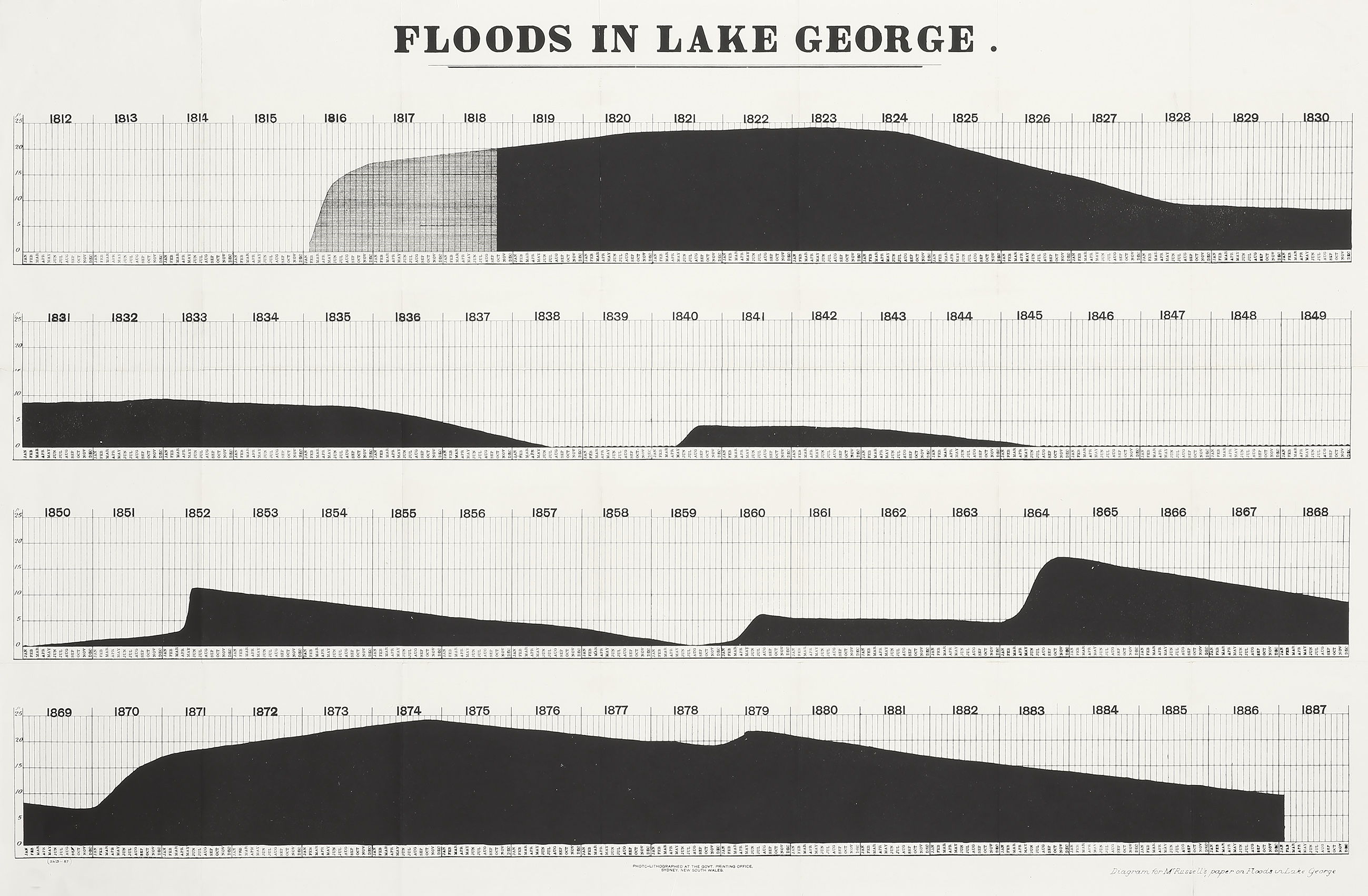 Rare c.19th chart recording the floods in Lake George from 1812-1887.