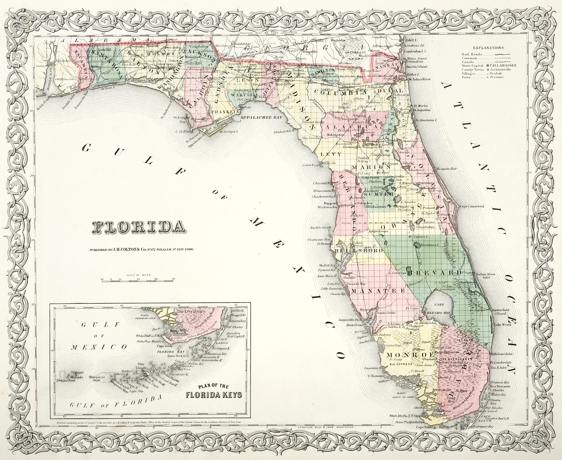 First edition of Colton’s detailed map of Florida from Colton’s, Atlas Of The World, Illustrating Physical And Political Geography, dated 1855 at the bottom of the map. An inset of: Plan of the Florida Keys, is at bottom left. Delineated are the counties, railways, roads, ports and forts. The map is surrounded by Colton’s signature, strap work scrolled border found on all of Colton’s maps from this atlas.
