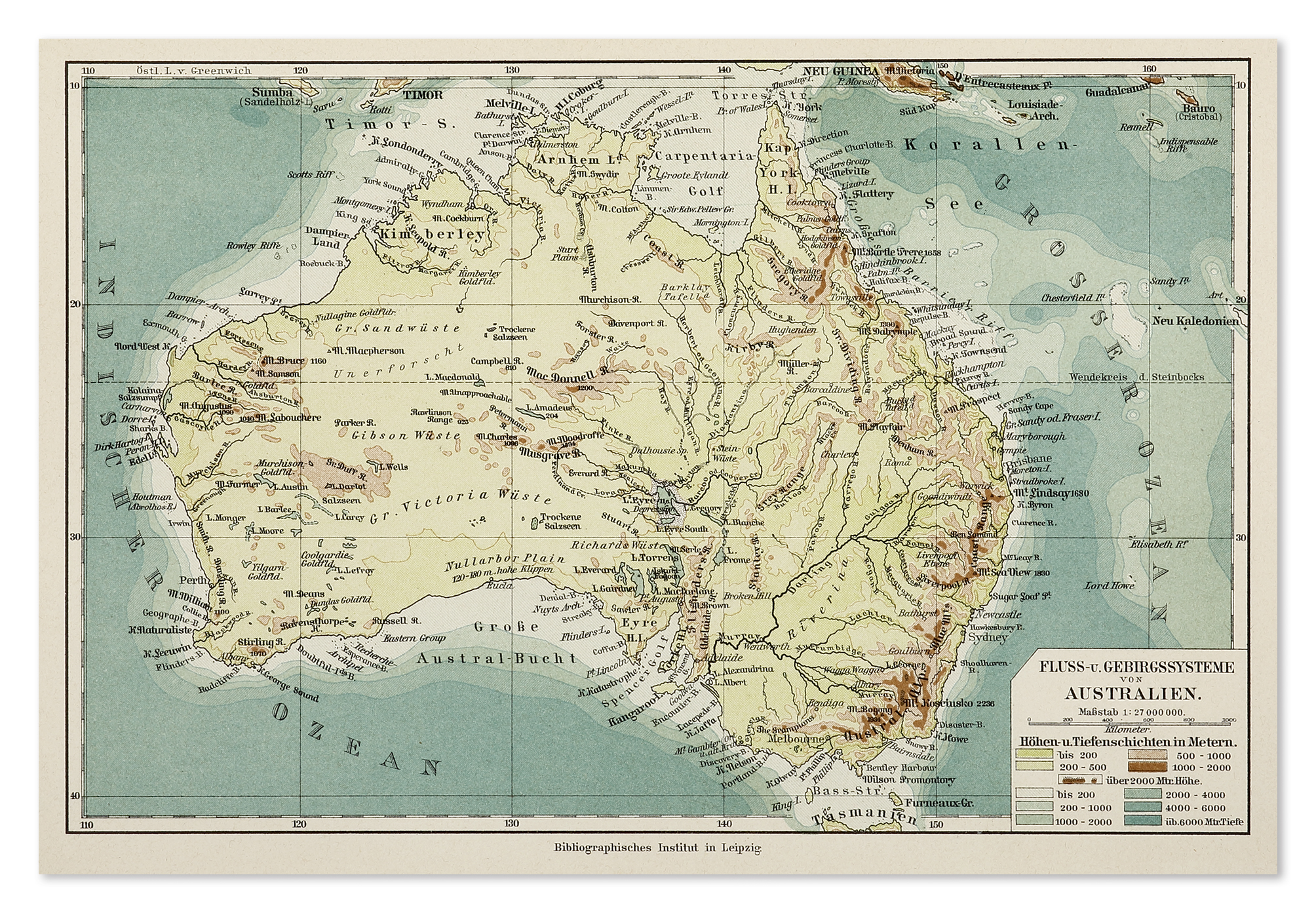Detailed c.19th German map of Australia showing elevations with colour key at lower right.