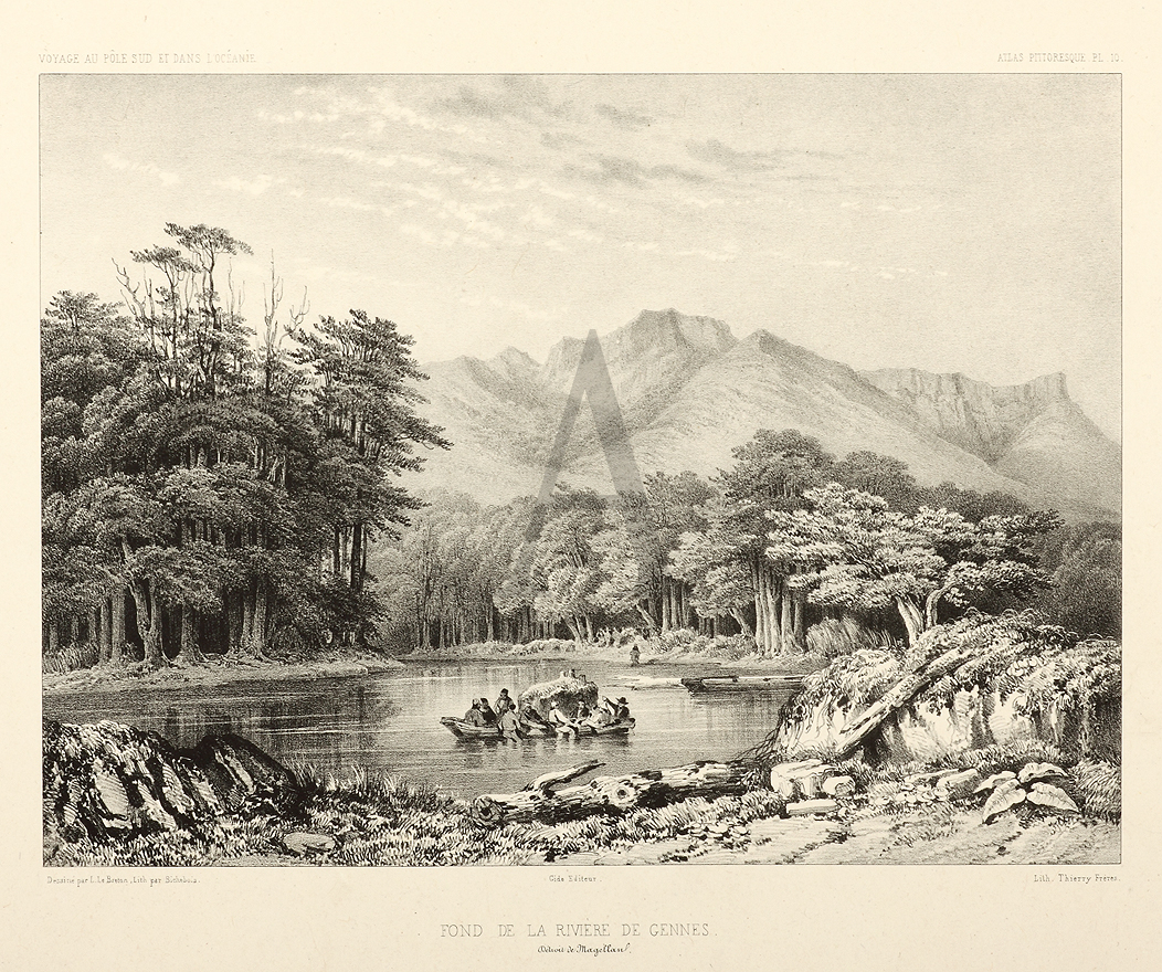Superb c.19th lithograph of the Gennes River which was named after Count Julien de Gennes (1652-1704). It is marked on early maps as being near Punta Arenas and south of Port Famine, Chile. From D’Urville, D. Voyage au Pole Sud … Read Full Description