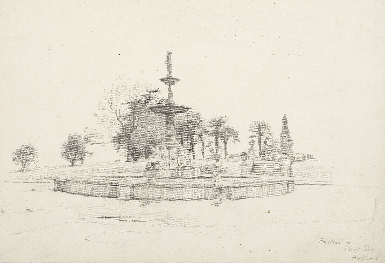 Fine unsigned pencil drawing of the fountain in Albert Park, Auckland by the artist and master print maker John Barclay Godson. Possibly a study for an etching. Provenance: Artists estate.