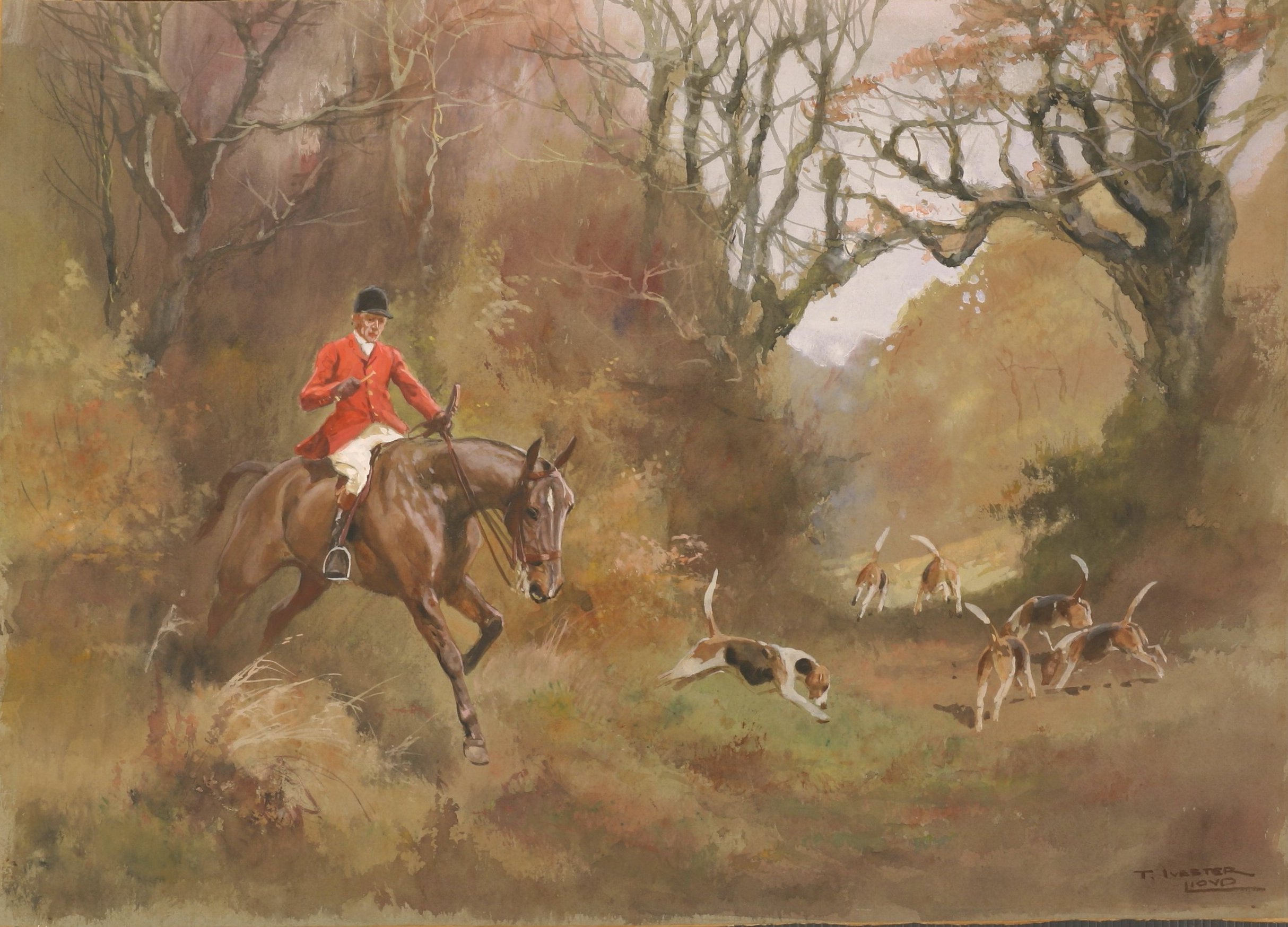 Superb original watercolours. Thomas Ivester-Lloyd was born in Liverpool, in 1873. During World War 1 Thomas saw service in France in 1914 with the Remount Service, and was later commissioned into the British Artillery. The War Office British Empire Exhibition in Wembley contained thirty dioramas of battles in British history painted by Thomas Ivester-Lloyd. The majority of his work was sporting and he illustrated the British section of sir John Buchanan Jardine’s Hounds of the World. He spent most of his life in and around Sherington, where he became Master of the Sherington Foot Beagles as well as being a pillar in the community. He illustrated a number of books and became very famous for his hound sketches. Many thought his horse portraiture was some of the of his time. He painted a series of beagling pictures and a variety of hunting scenes, working both in oil and watercolour. The majority of Thomas Ivester-Lloyd’s work was serious but he also made some humurous illustrations. He died in 1942.