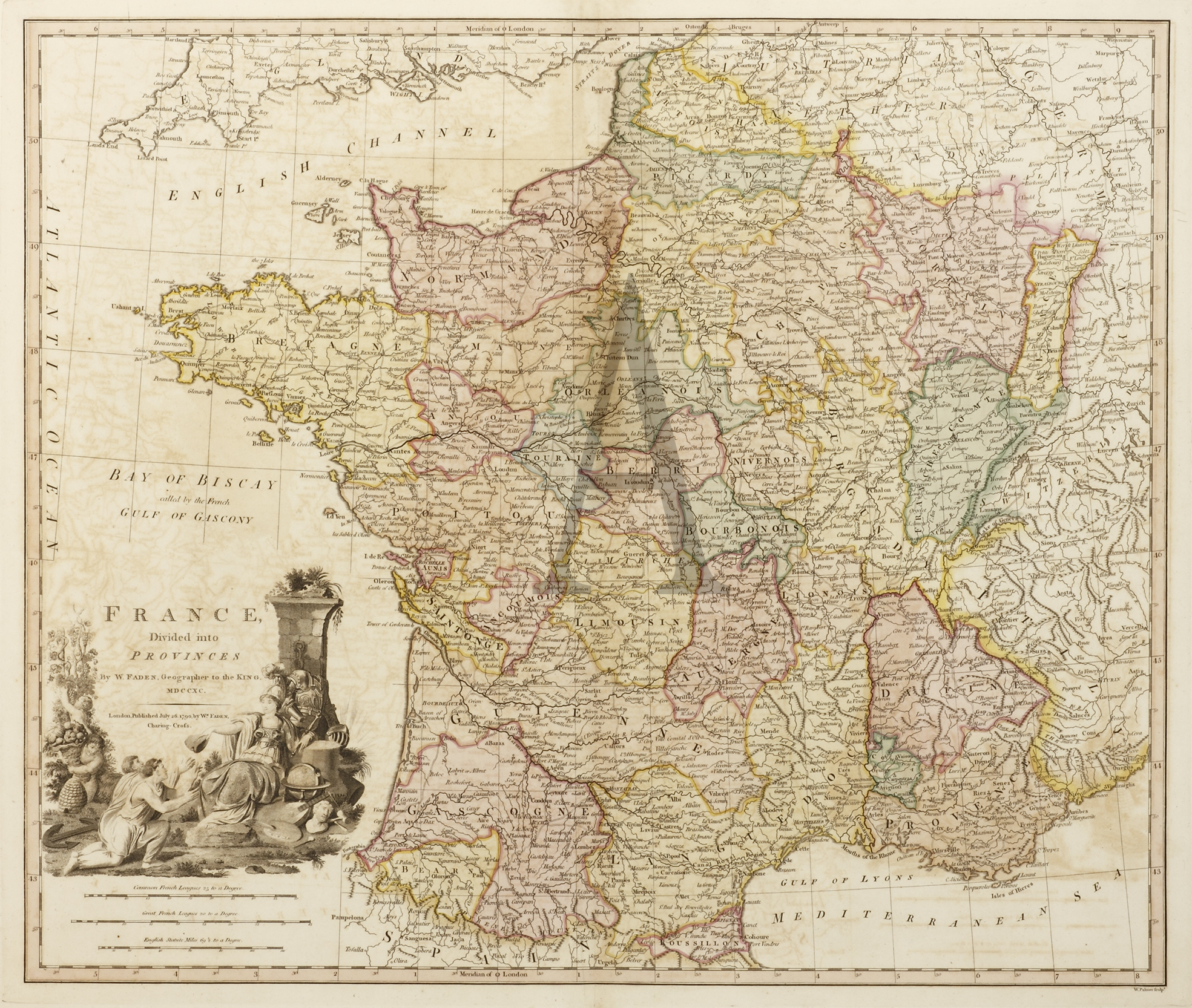 Superb map of France with elaborate title cartouche . Wyld was one of Britain’s best known mapmaker and mapseller. His many maps often provided recent and accurate information derived directly from explorers and parliamentary sources. He was famous for building ‘Wyld’s Great Globe’, a hall in the shape of a globe some 18 metres in diameter in which visitors could ‘see’ the world from inside out. The attraction, in London’s Leicester Square, was second only to the Great Exhibition in visitor numbers.