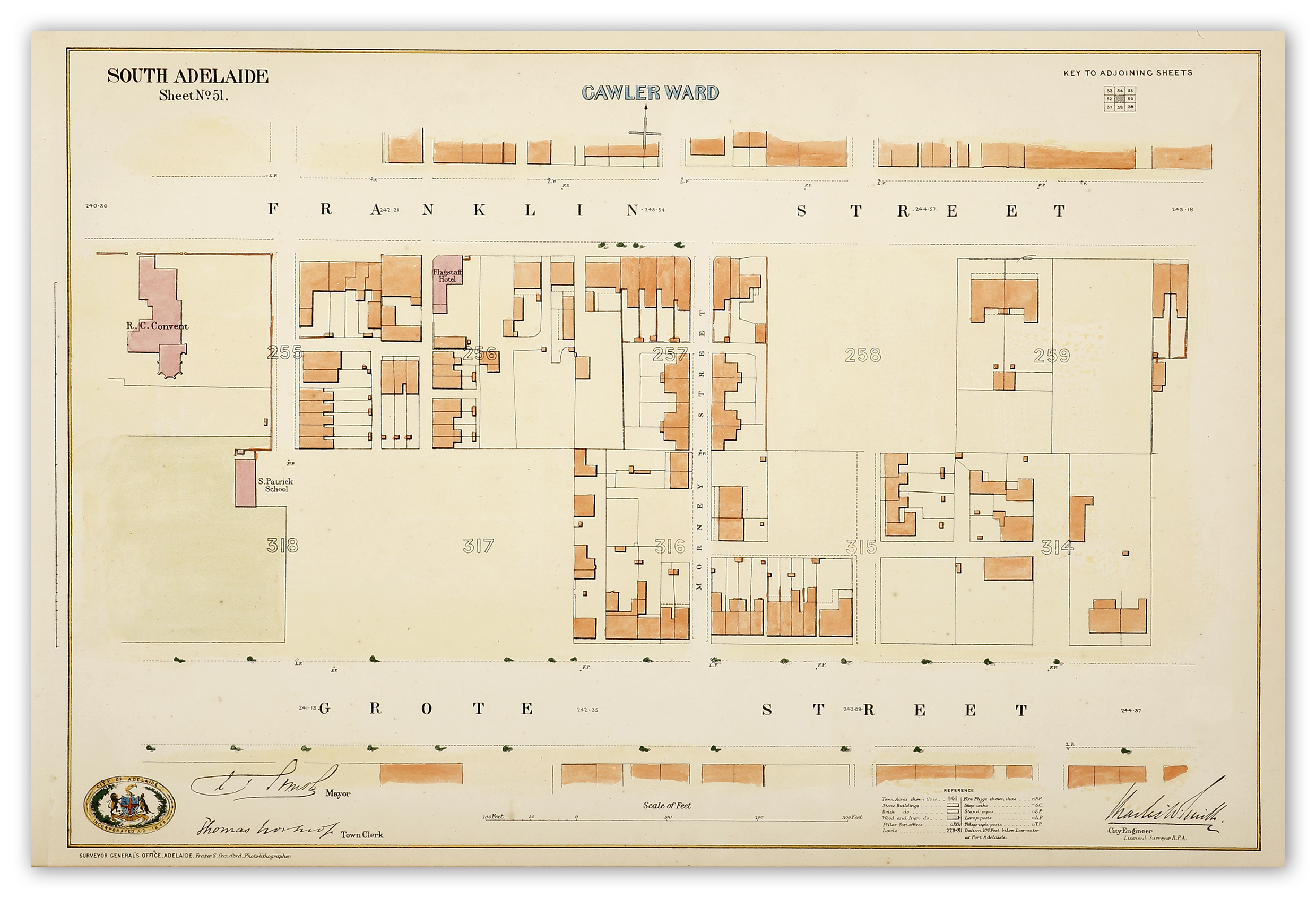 In July 1877 the Adelaide City Council commissioned the eminent English engineer, William Clark (1821-1880) to assess and propose a system of drainage for the city of Adelaide. Clark’s proposal was accepted and prior to commencement of the works Clark required a detailed cadastral survey of the city to be made. On 18 February 1878 the Council instructed John Lloyd Hyndman (1836 – 1878) the City Engineer and Surveyor to prepare a large detailed plan of the city of Adelaide to show; permanent from temporary buildings, the levels not only of the street surfaces, but of the back yards, the levels and positions of cellars where they exist, and points where drainage will be required, such as kitchen sinks, water taps, stack pipes, water closets on a scale of 40 feet to the inch. Work proceeded but on 4th August 1878, Hyndman unexpectedly died and was replaced by the engineer Charles William Smith.