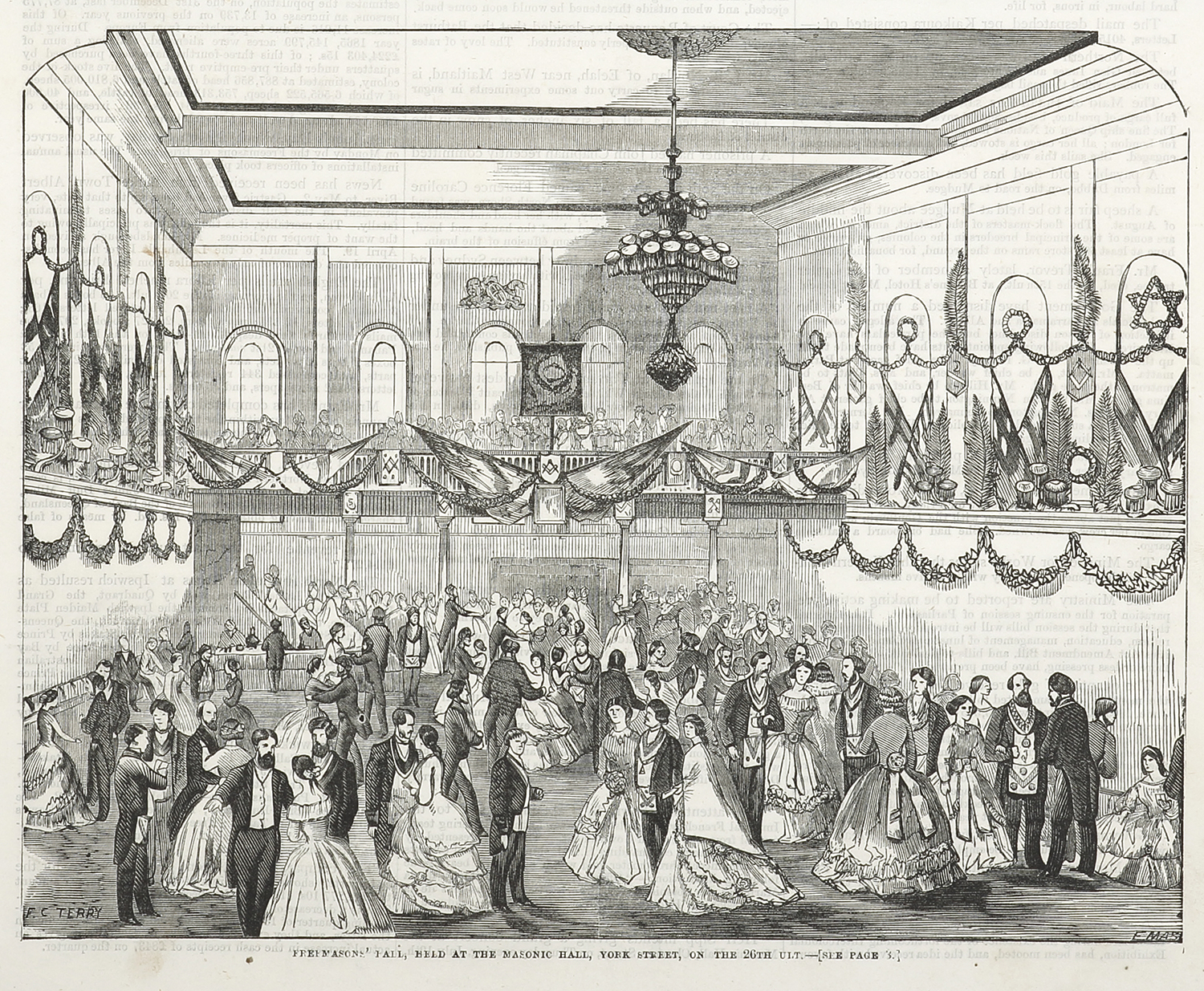Rare engraving of the interior of the Masonic Hall, Sydney in 1866 by F.C. Terry (1825-1869).