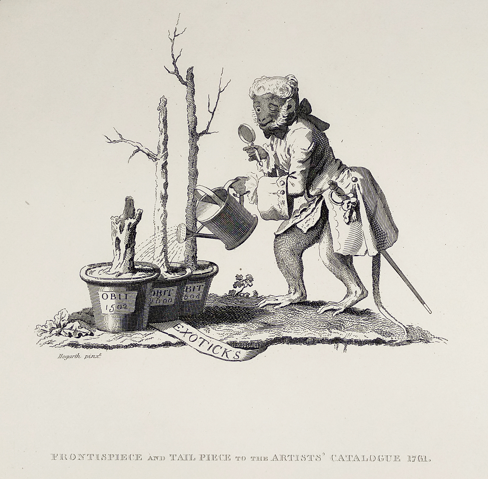 Hogarth introduces three dwarfish importations of decayed Nature, to indicate the state of those old and damaged Pictures which are venerated merely for their antiquity, and exalted above all modern productions, from the name of a great Master, rather than any intrinsic merit. To heighten the ridicule, he has given his Monkey a magnifying-glass that will draw forth beauties invisible to common optics.