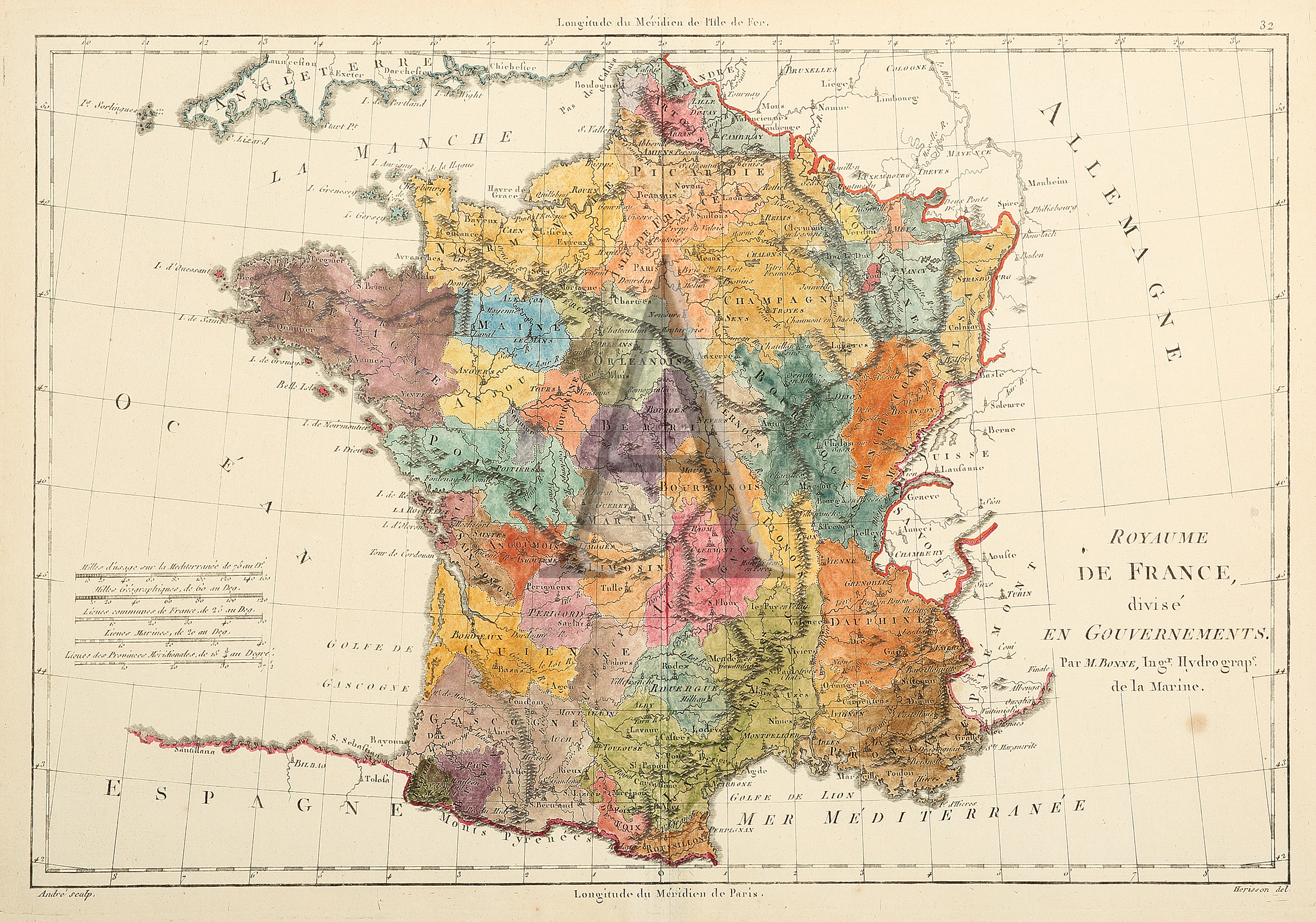 Scarce map of France. From Bonne’s, Atlas Encyclopedique, Contenant La Geographie Ancienne, et Quelques Cartes sur La Geographie du Moyen Age, La Geographie Moderne, et les Cartes Relatives a la Geographie Physique.