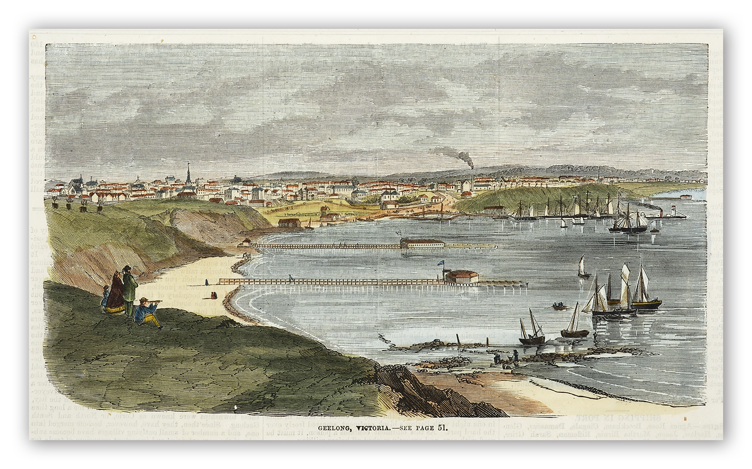 Scarce colonial engraving of Geelong Harbour taken from an elevated vantage point above Eastern Beach. The jetty in the mid-distance is an extension of Moorabool Street ,(ships are tied up along the full length of the pier).
