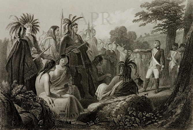 Burgoyne accompanied by two officers on foot, talking with three Canadian Indian dignitaries, wearing feathers and tall headdresses.