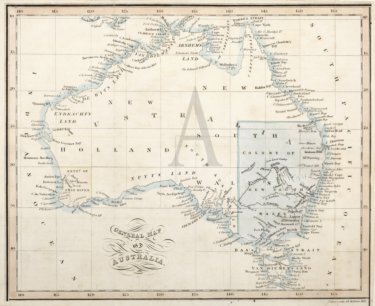 Very rare map of Australia with numerous place names and ‘tColony of New South Wales’ and ‘Settt. of Swan River’ both highlighted in colour. A number of place names in Swan River are recorded, including Dale River 1829, York 1832, Mount Caroline, Beverly 1829, Colley River (Collie) 1829, Blackwood River 1827, Augusta 1830, Lake Katharina.