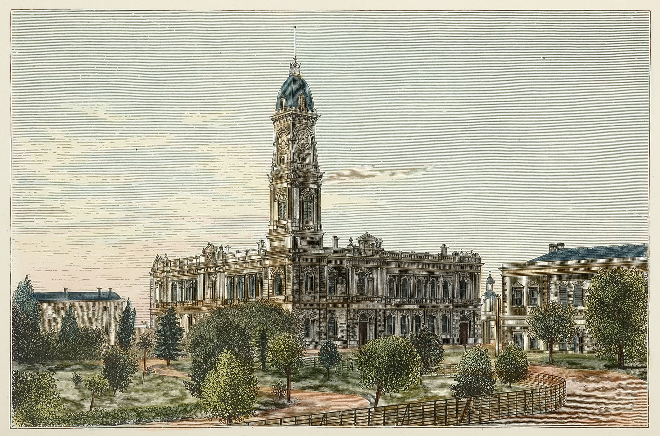 Colonial engraving of the GPO building, King William Street, Adelaide, taken from Victoria Square.
