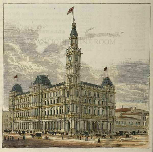 Scarce c.19th hand coloured engraving of the GPO building Collins Street, Melbourne.