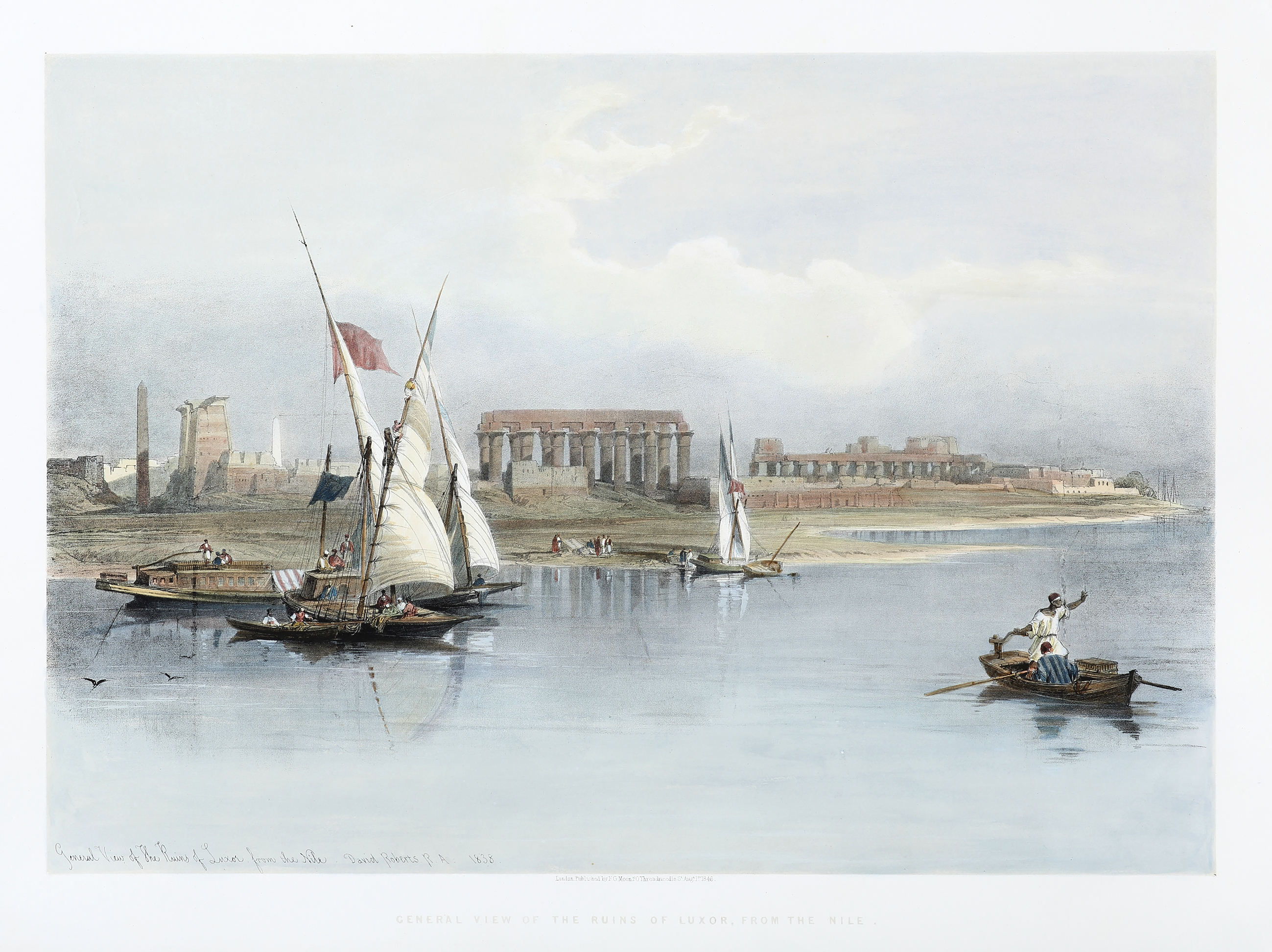 Roberts sailed to Alexandria in 1838 and for eleven months travelled up the Nile River, across deserts and mountains, through Egypt and the Holy Land, to arrive in Jerusalem on Easter 1839. He continued north to Lebanon and departed from Beirut in May. Roberts recorded his impressions of landscapes, temples, ruins, and people in three sketchbooks and more than 272 watercolours. These sketches and paintings provided the basis for the lithographs published between 1842 and 1849 as, The Holy Land, Syria, Idumea, Arabia, Egypt, Nubia.