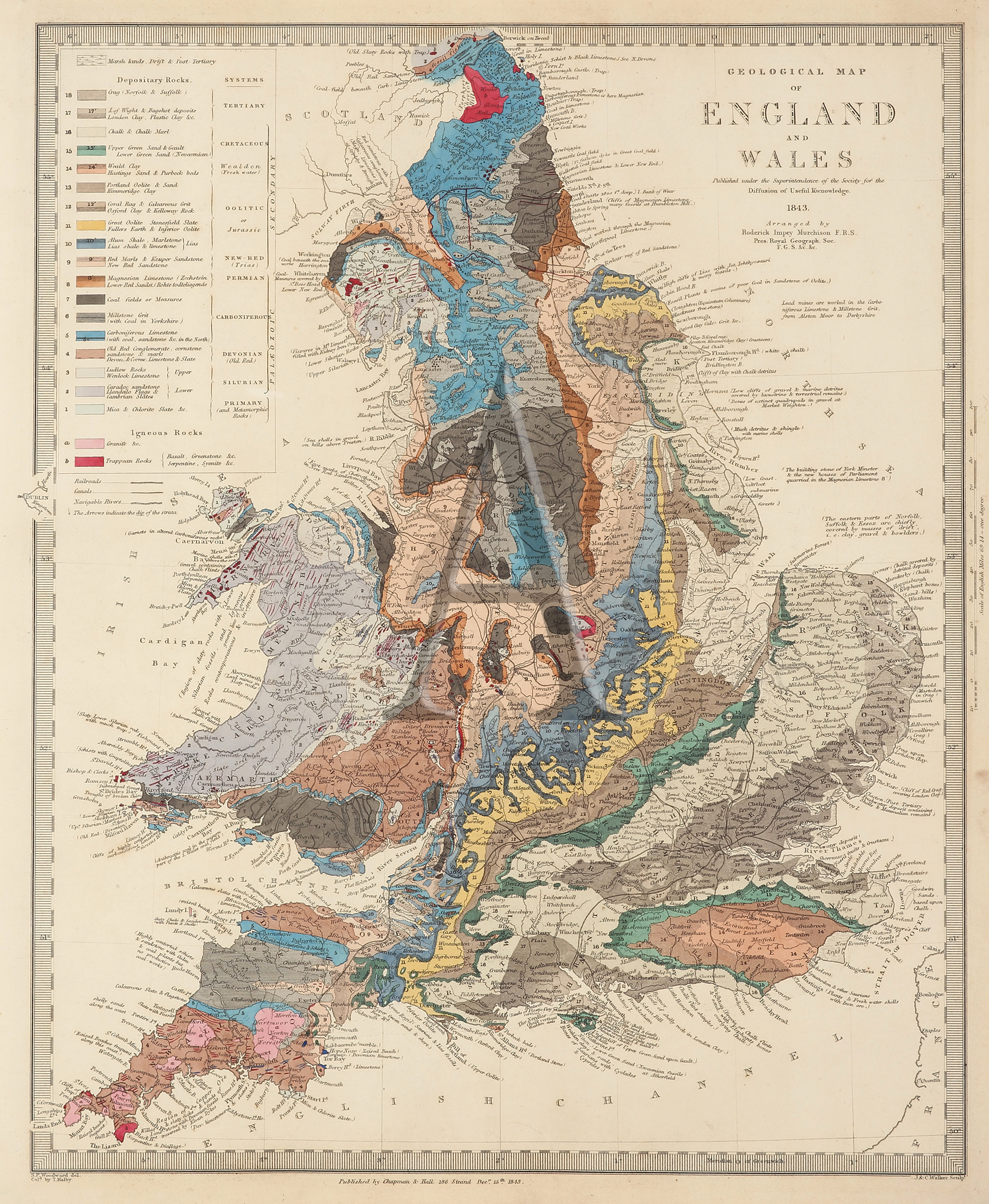Very detailed geological map of England and Wales, based on the first large scale map by William Smith in 1815 and plagiarised by George Bellas Greenouth in 1820. The colouring of this map is nearly identical to the Greenough map.