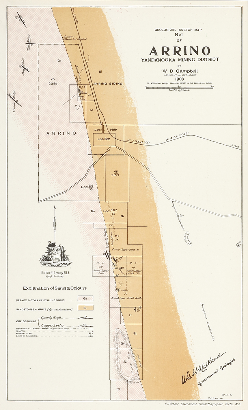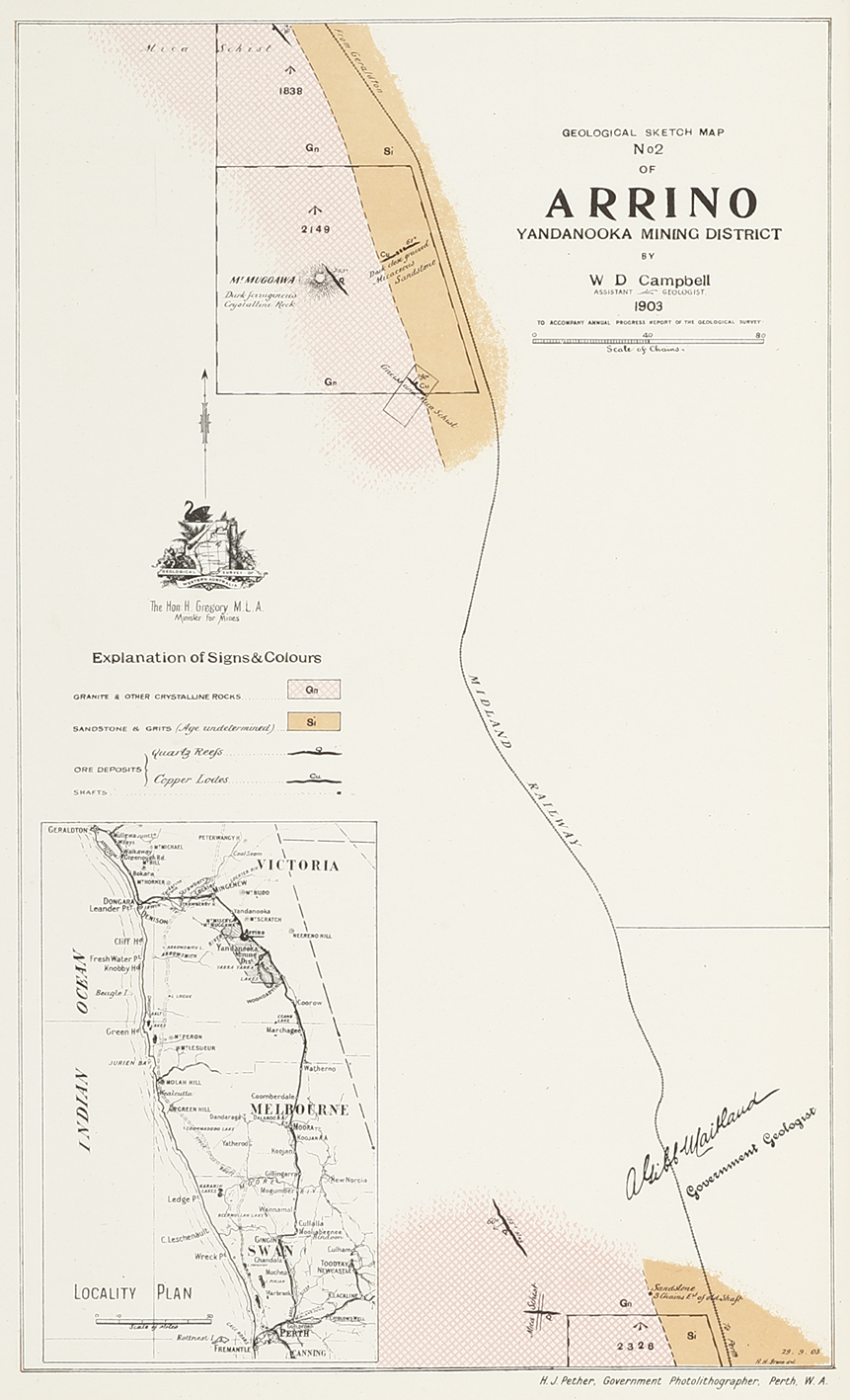 Small early pair of geological maps of the Arrino district of Western Australia, from the geological surveys conducted by the pioneering government geologist for Western Australia, Andrew Gibb Maitland (1864-1951). Maitland was an acknowledged authority on underground water and had early successes in the West locating bores between Geraldton and North West Cape that still supply water. Water and gold were then crucial to prosperity in the West and Maitland and his staff inevitably devoted much attention to the goldfields. He spent several long and arduous seasons from 1903 in the Pilbara region, mapping a vast area and seeking geological order among its ancient rocks. In 1901 he had worked in unknown parts of the Kimberley division as geologist to an expedition led by F. S. Drake-Brockman.