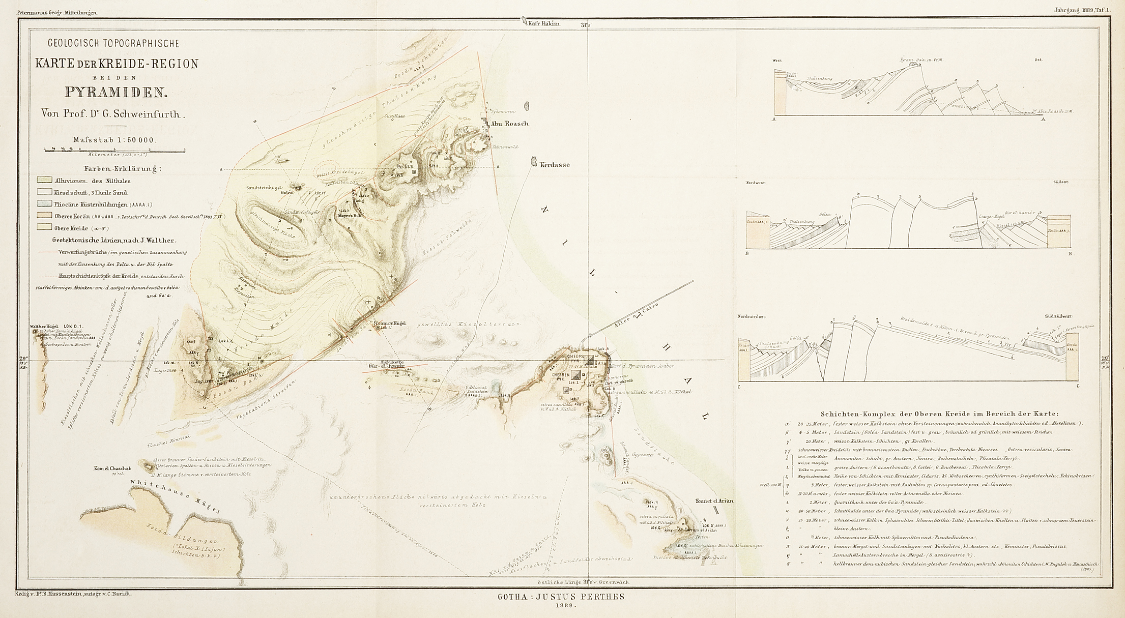 Scarce geological map of the Great Pyramid showing the chalk region of the two pyramids. From Petermann’s, Geographia Mittheilungen.