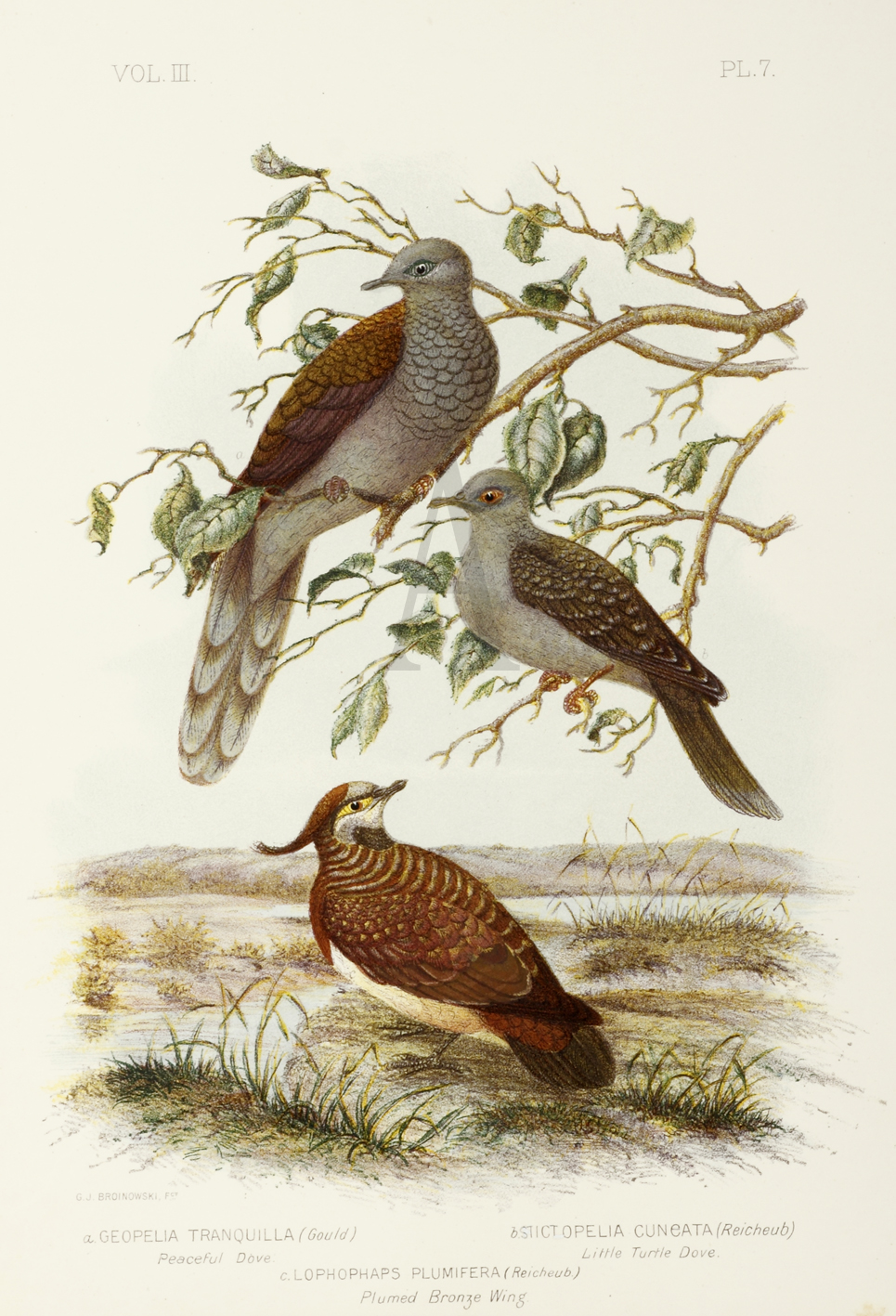 Geopelia Tranquilla. Peacful Dove. Stictopelia Cuncata. Little Turtle Dove. Lophophaps Plumifera. Plumed Bronze Wing. - Antique Print from 1889