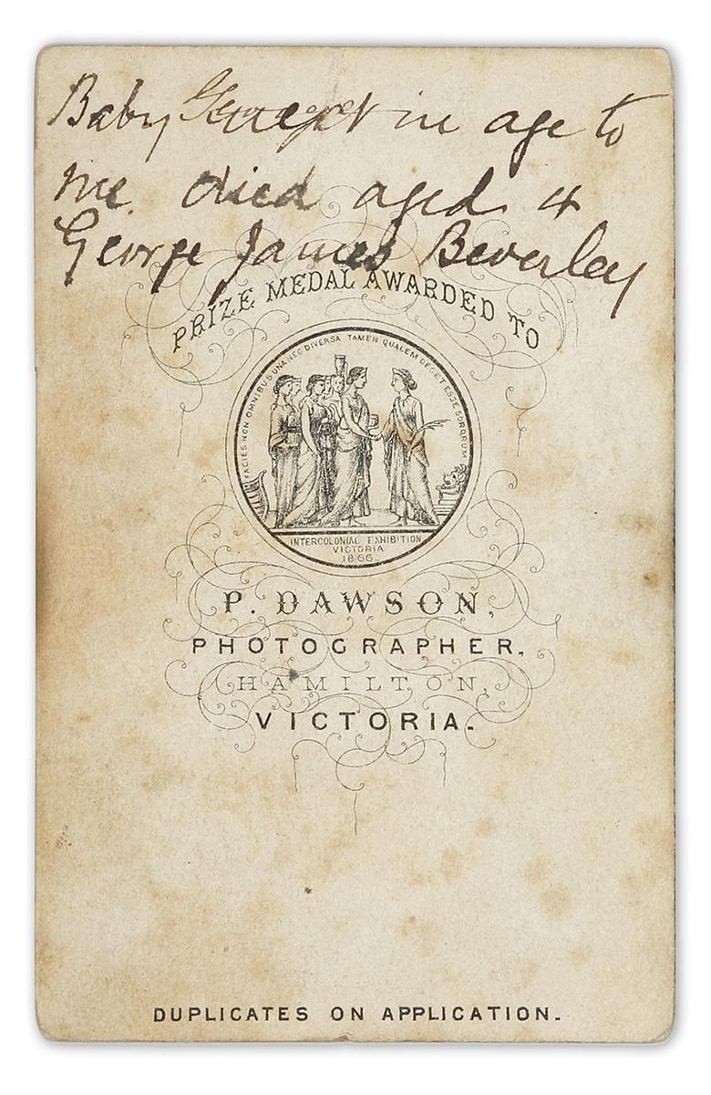 Hand written on the verso in Indian ink is the following; “Baby George next in age to me, died aged 4 George James Beverley”.