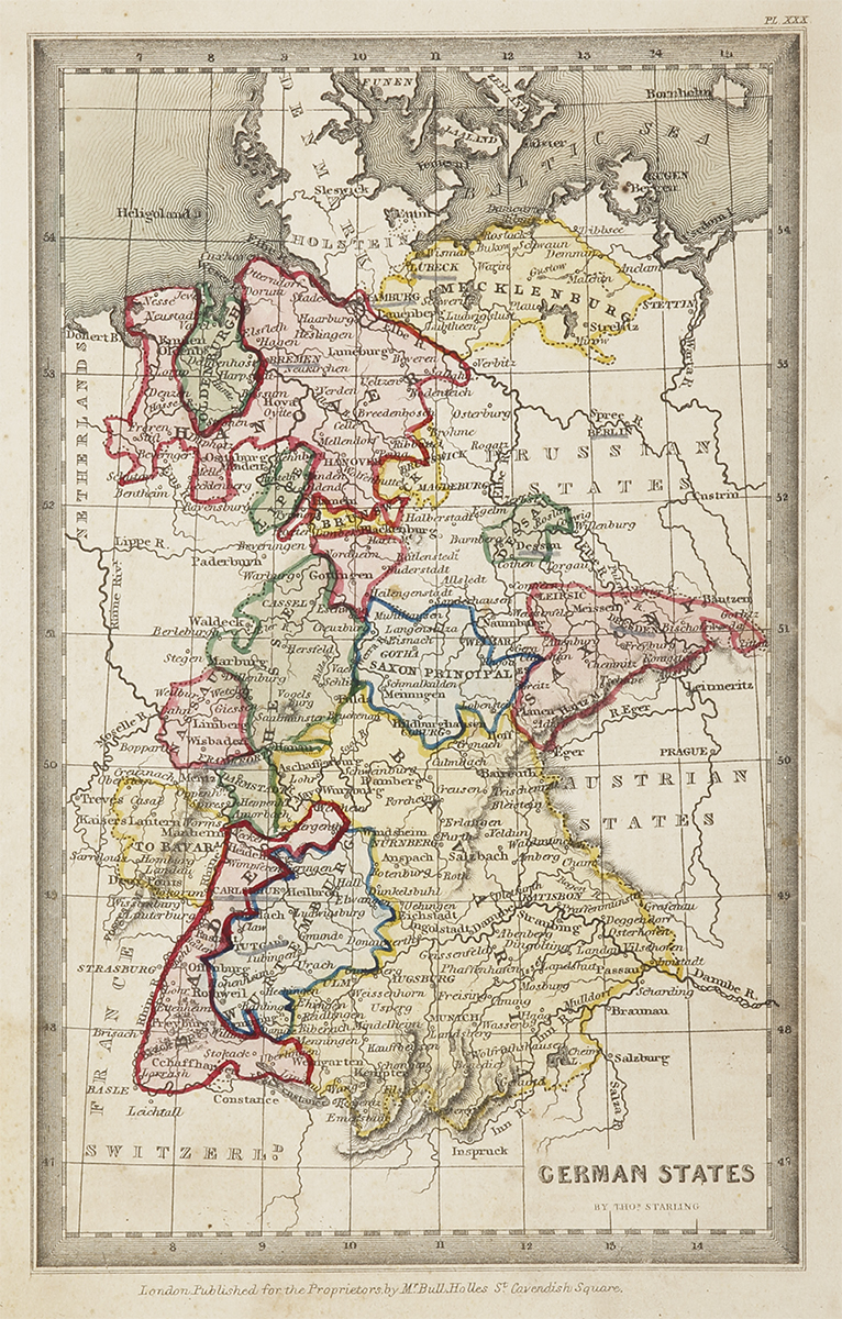 Finely engraved early c.19th miniature map of Germany by Thomas Starling (1796-1850).