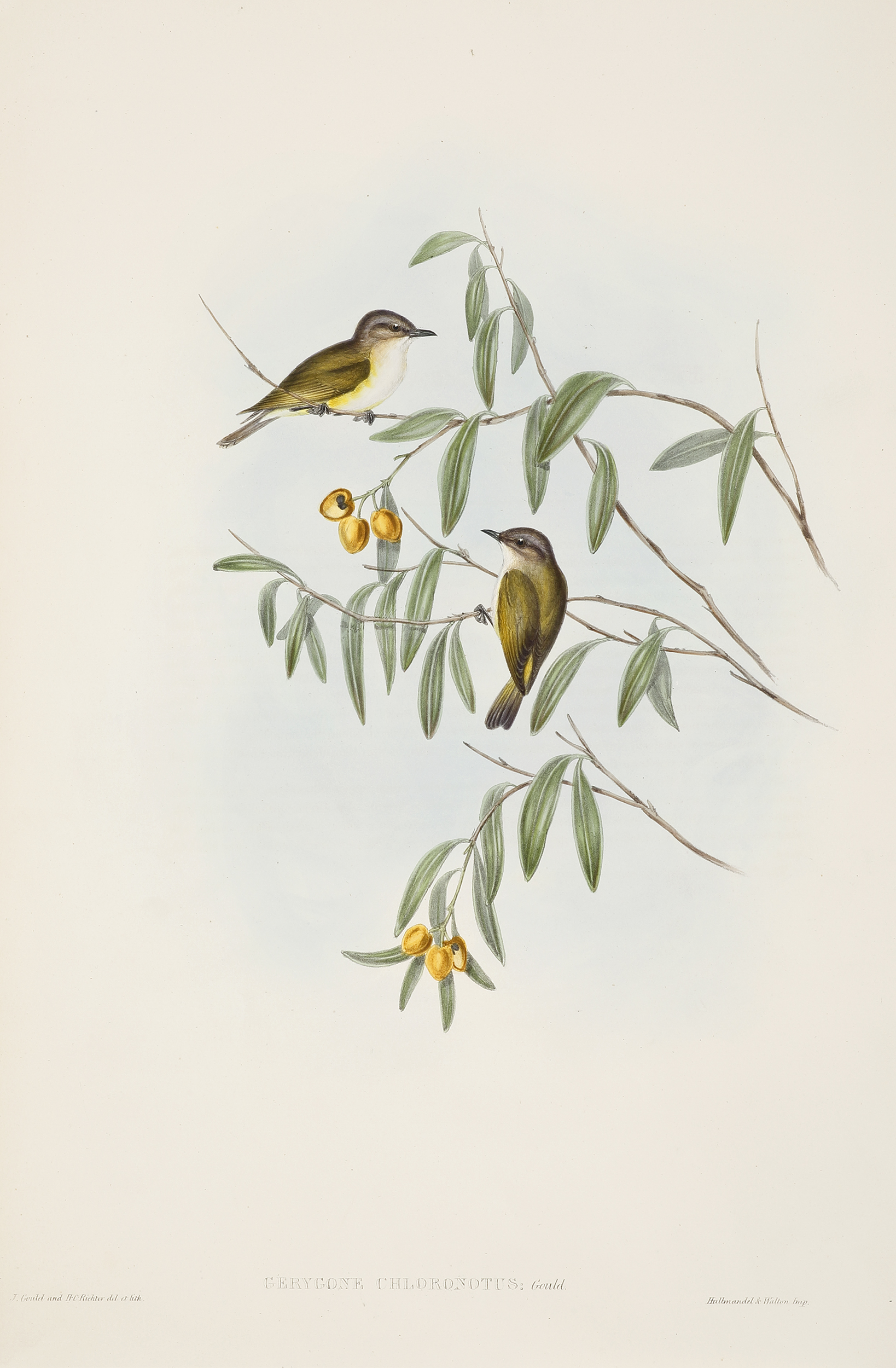 Rare c.19th hand coloured lithograph of the best and largest colonial image of the Green-backed Gerygone by John Gould from his epic series, The Birds of Australia and Adjacent Islands, published for the author, printed by Richard and John E. Taylor, London.