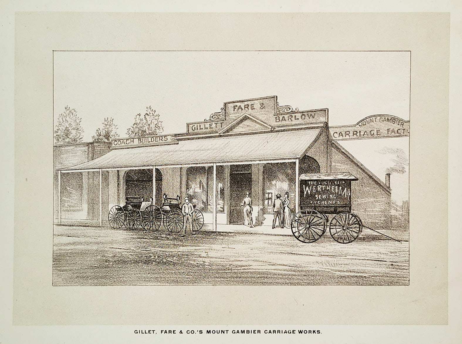 Colonial lithograph of Gillet and Far carriage works, Mount Gambier.