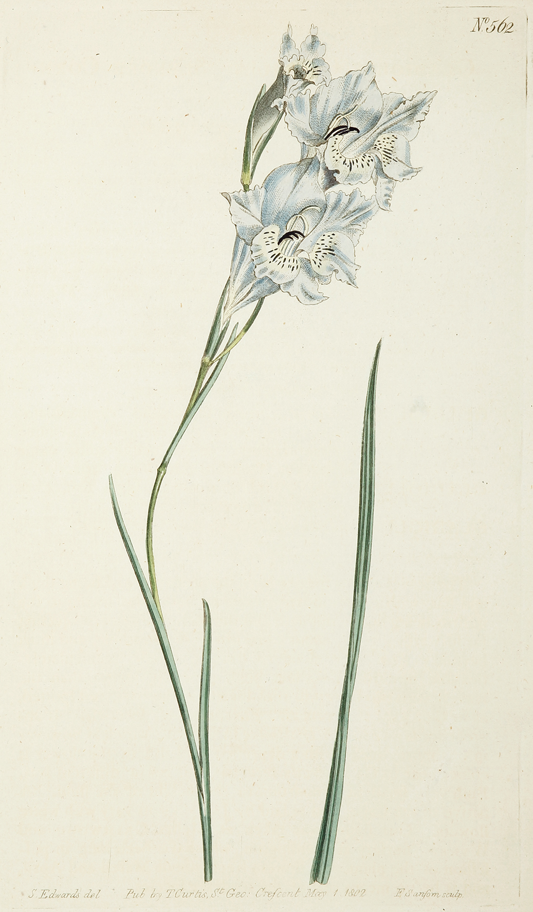 Fine original hand coloured botanical illustration of the Gladiolus plant from Curtis’s Botanical Magazine: or, Flower-Garden Displayed.