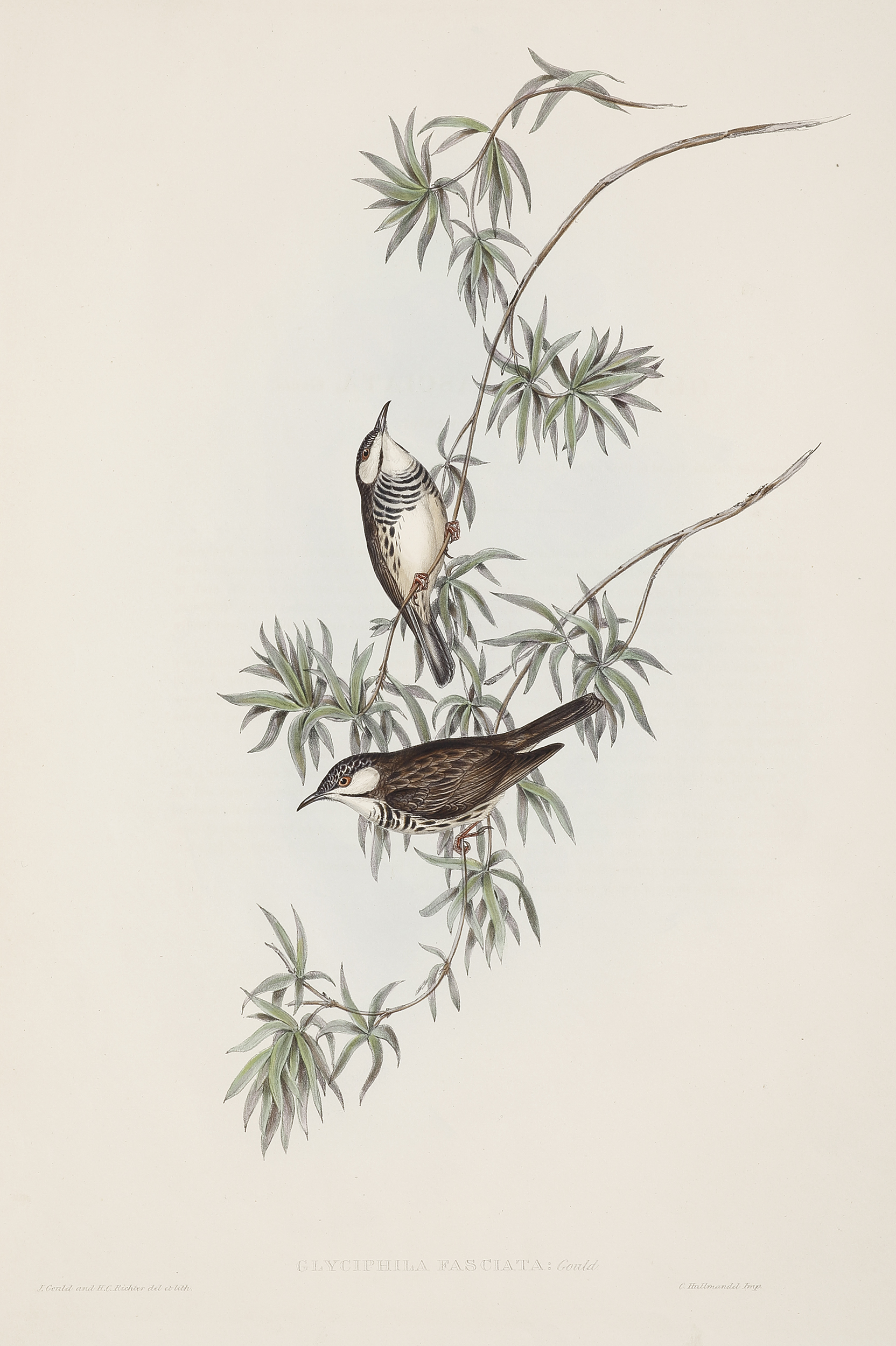 Rare lithograph of the best and largest colonial image of the Bar-breasted honeyeater by John Gould from his epic series, The Birds of Australia and Adjacent Islands, published for the author, printed by Richard and John E. Taylor, London.