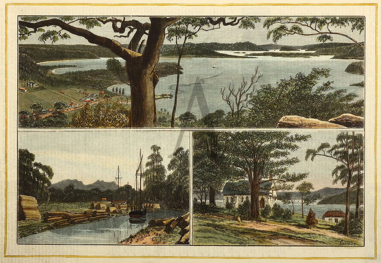 Rare c.19th early engraved view of Gosford, Narrara Creek and East Gosford. Gosford was declared a town in 1885, although small farms and timber cutters were established in the area from the 1830s.