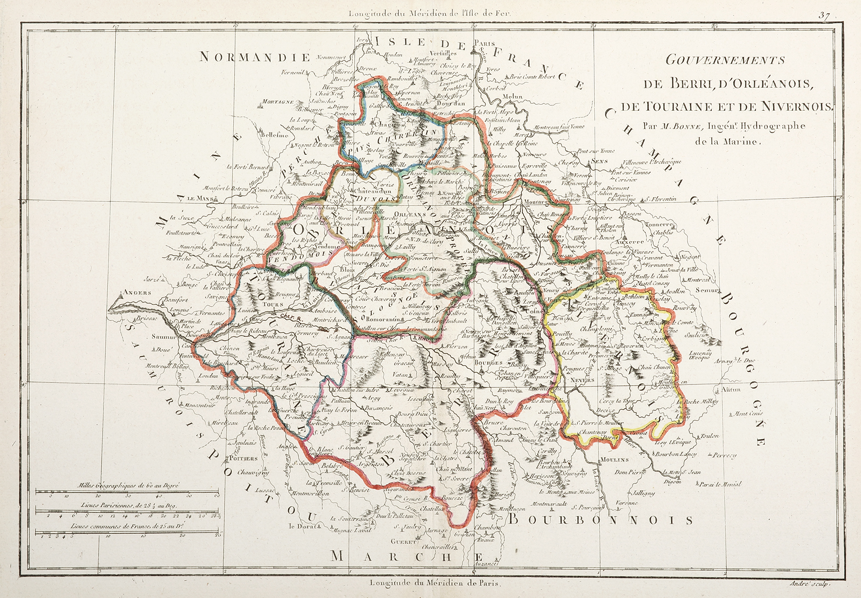 Scarce map of the Centre-Val de Loire region, France. From Bonne’s, Atlas Encyclopedique, Contenant La Geographie Ancienne, et Quelques Cartes sur La Geographie du Moyen Age, La Geographie Moderne, et les Cartes Relatives a la Geographie Physique.