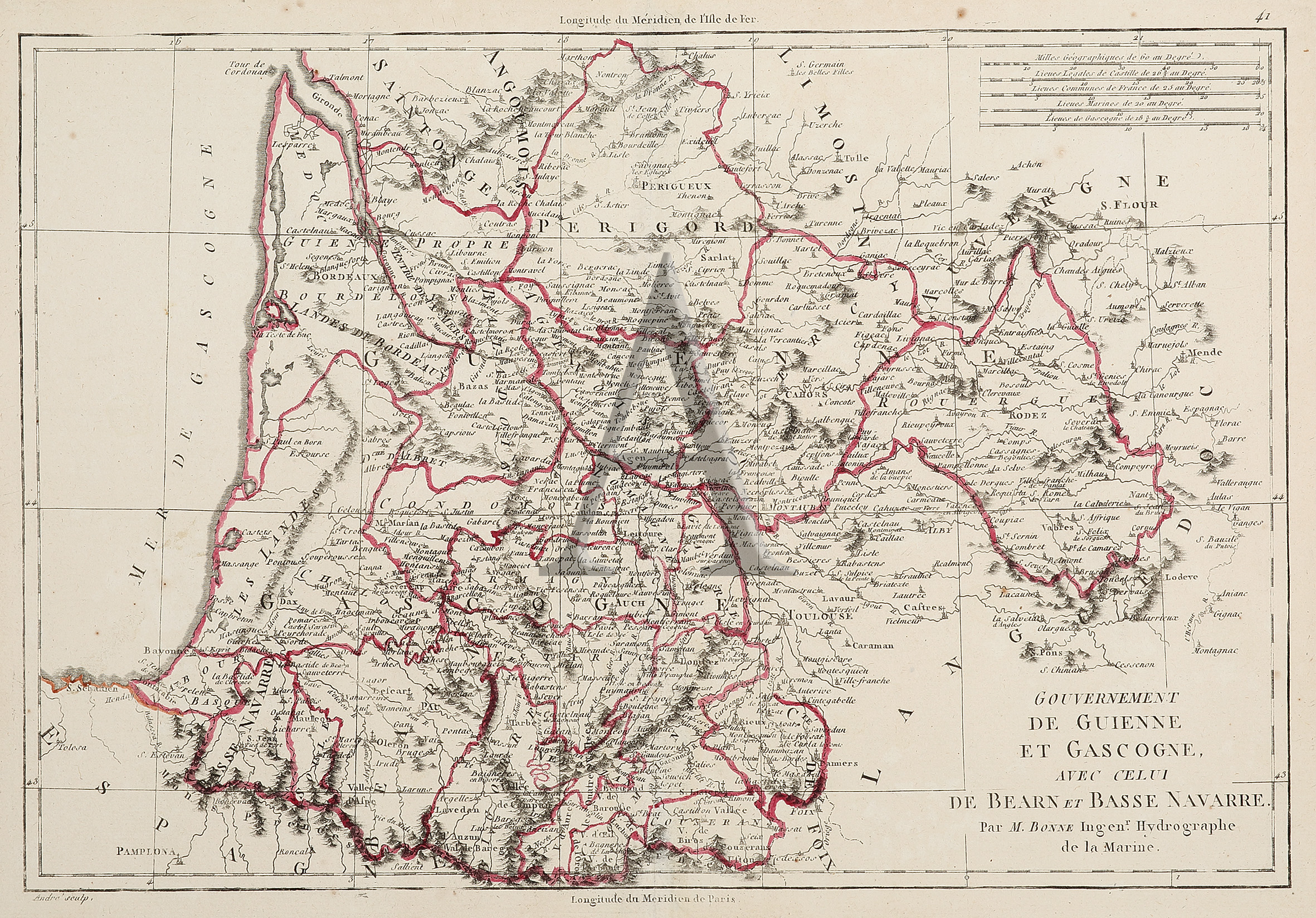 Scarce map of the south west region of Aquitante, France. From Bonne’s, Atlas Encyclopedique, Contenant La Geographie Ancienne, et Quelques Cartes sur La Geographie du Moyen Age, La Geographie Moderne, et les Cartes Relatives a la Geographie Physique.