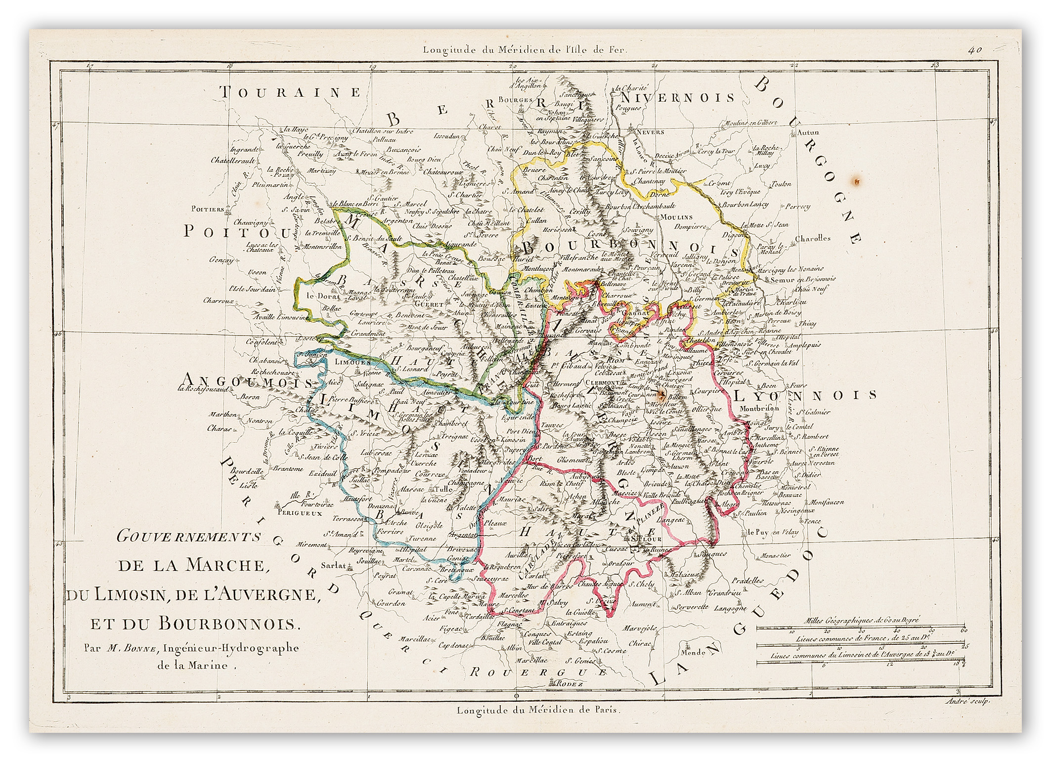 Bonne was an important French cartographer active in the later part of the C18th. In 1773 Bonne succeeded Jacques Nicolas Bellin as Royal Cartographer to France in the office of the Hydrographer at the Depôt de la Marine. Working in his official capacity, Bonne compiled some of the most detailed and accurate maps of the period. Bonne’s work represents an important step in the evolution of the cartographic ideology away from the decorative work of the 17th and early 18th century towards a more detail oriented and practical aesthetic.