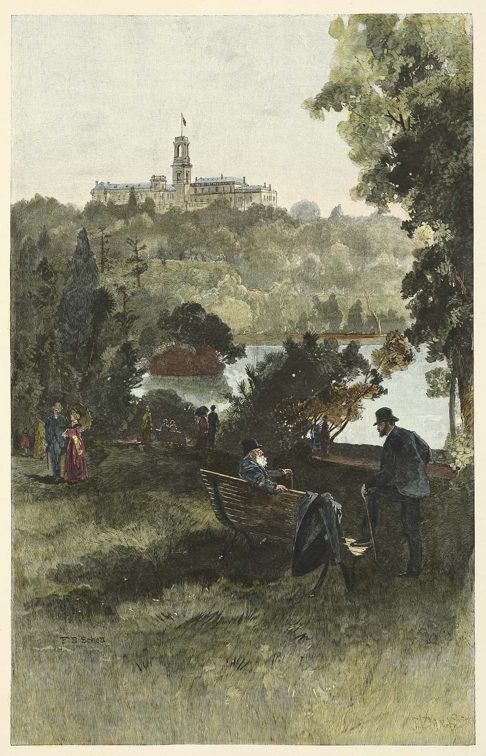 Schell was an American employed as the senior artist on the most ambitious colonial publication ever attempetd, The Picturesque Atlas of Australasia. He arrived in Sydney with two other American artists, W.T. Smedley and W. C. Fitler, plus a number of engravers including Horace Baker. When Phil May returned to England in 1888 Schell accompanied him. The Grafton Gallery 'Exhibition of Australian Art in London’ 1898 included F.B. Schell, cat.250, 'Junction of the Murray and Darling Rivers, N.S.W.’, cat.254, 'Hamilton Reach, Brisbane’, cat. 255, 'Sydney Harbour, N.S.W.’, lent by the Trustees of Sydney Gallery. He is represented in a number of institutional collections.