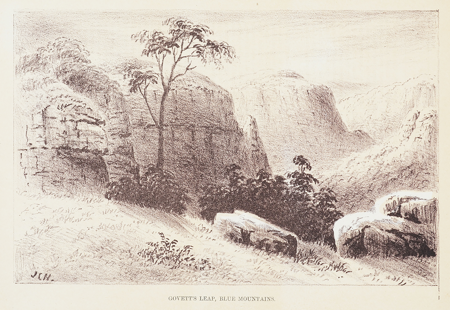 Scarce c.19th sepia lithograph of Govett’s Leap, Blue Mountains by John Campbell Hoyte (1835–1913).
