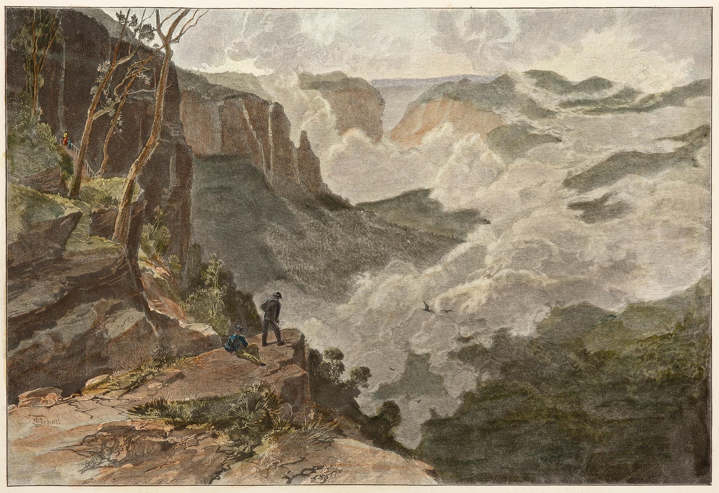 Colonial engraving of Govett’s Leap, named by Governor Macquarie who when passing through the area on his way to the new settlement at Bathurst, declared ‘it having a rather wild heath-like appearance, I have named it Hounslow.‘ On his return sixteen days later he changed his mind and on 15 May 1815 he wrote in his diary ‘This place having a black wild appearance I have this day named it Black-heath.